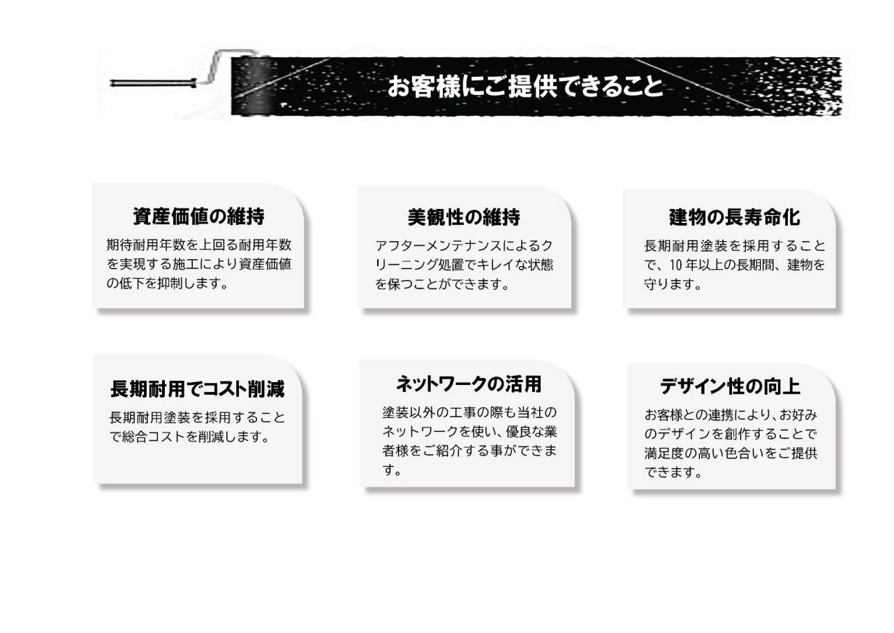 当社ではワンランク上の塗料を用いて耐用年数に余裕を持ったプラン設計にしておりますので、提案年数を下回らないご提案を可能としています。