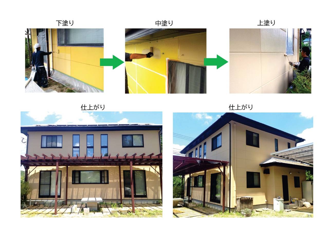 断熱塗装は4~5工程が多い中、この ”断熱コートEX” はシーリングや下地処理、高圧洗浄を行った後は、通常の塗装工程と同様に、下塗り+中塗り+上塗り の3工程でOK !