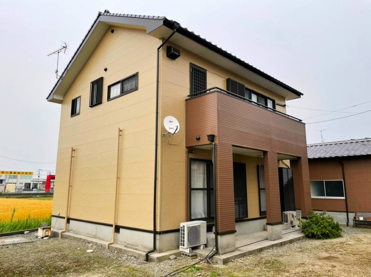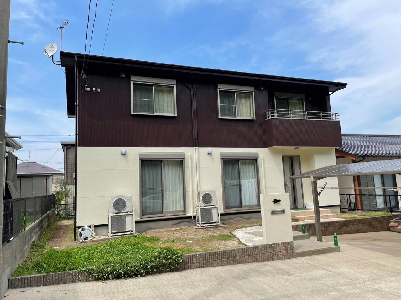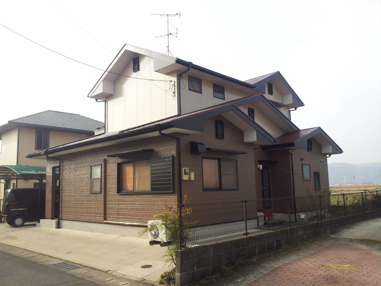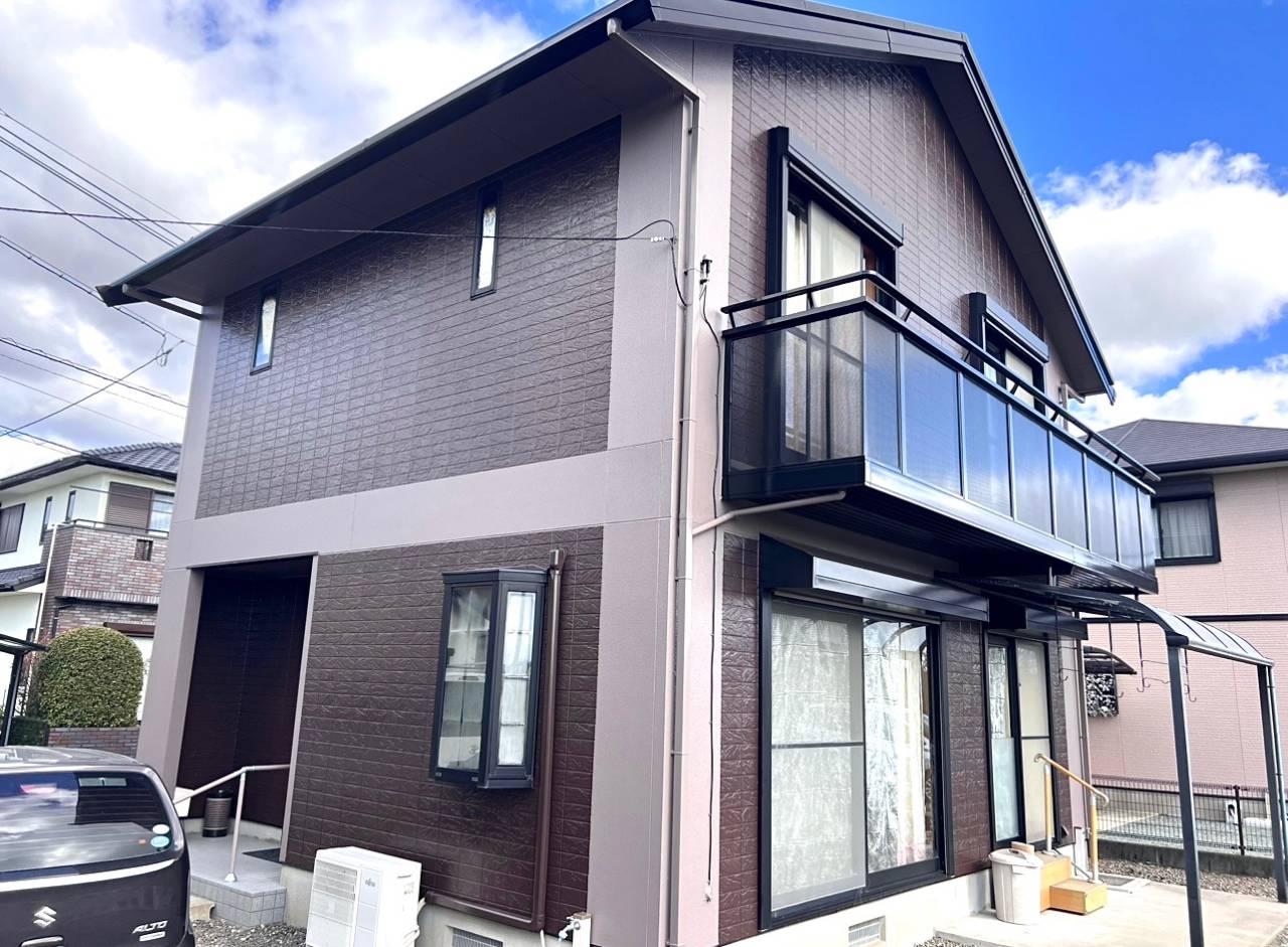 color= 2階 アステック ニュートラルホワイト色、1階 関西ペイント 水性ゾラコート茶系色(多彩模様吹付)