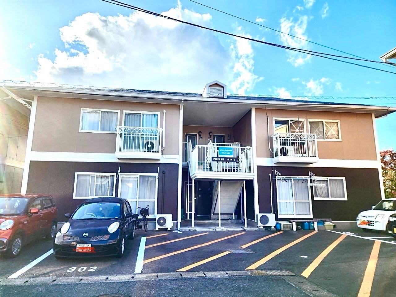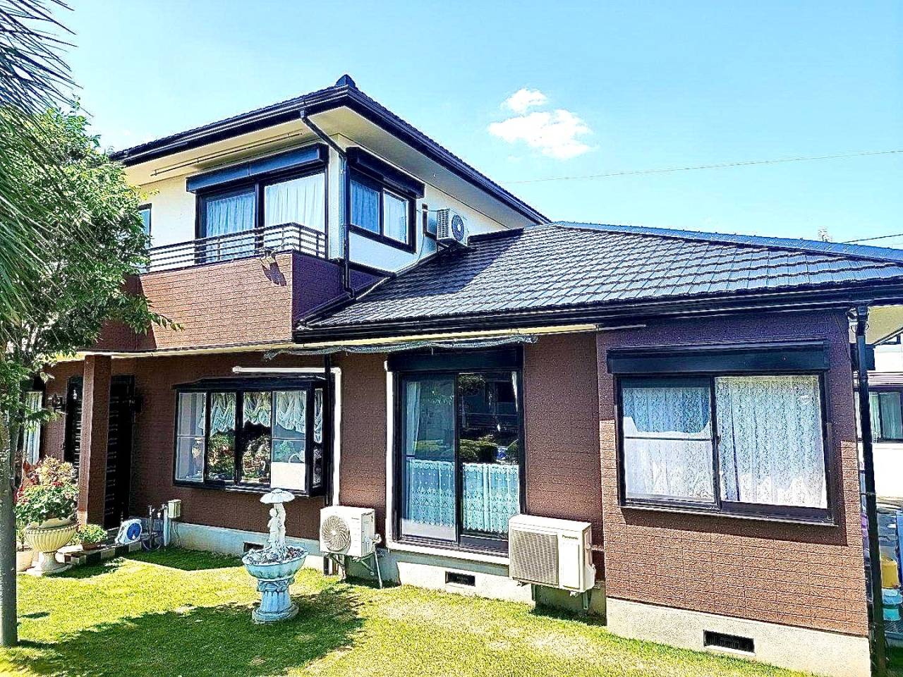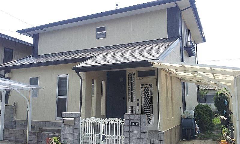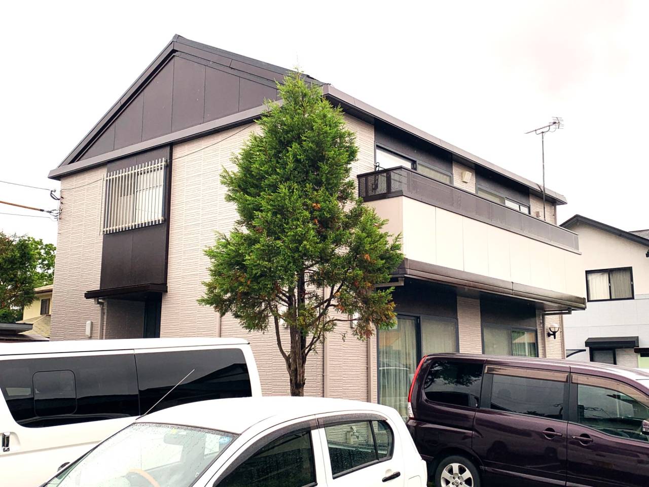 color= 2階 アステック ニュートラルホワイト色、1階 関西ペイント 水性ゾラコート茶系色(多彩模様吹付)