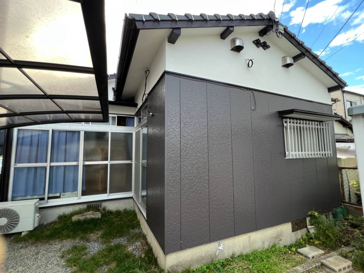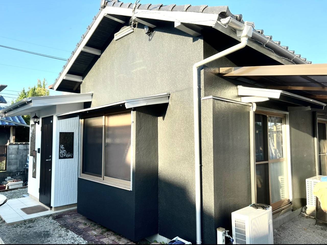 ※外壁全体と軒部をダークなイメージにすることで、写真では分かりにくいのですが、破風や雨どい部分のシルバー色を引き立てます。