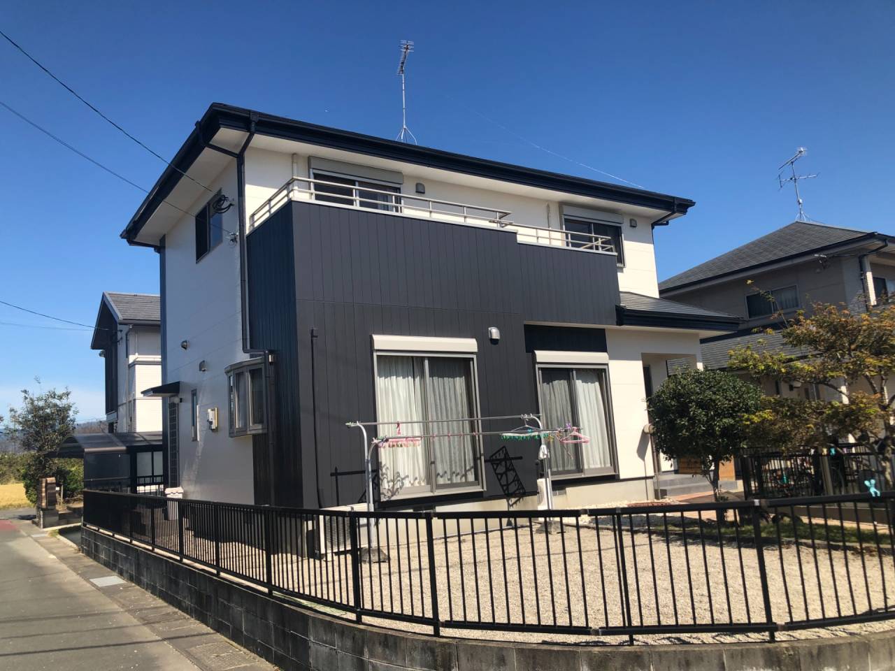 屋根部分と比べるとお分かりのように外壁色分け部分の色が真っ黒でなく、濃いめのダークグレー色にすることで、柔らかく魅せております。