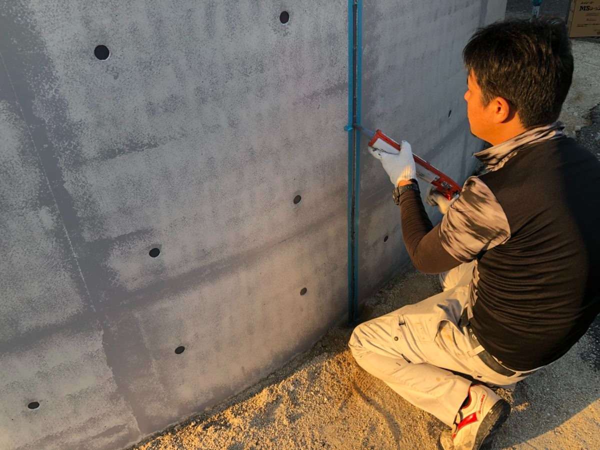 工程としては表面の下地処理 (溶剤を使用した油分除去) → 目荒らし研磨 → 穴埋め → 撥水材塗装 → 下塗り → 中塗り → 上塗り → 模様付け → シーリング工事
