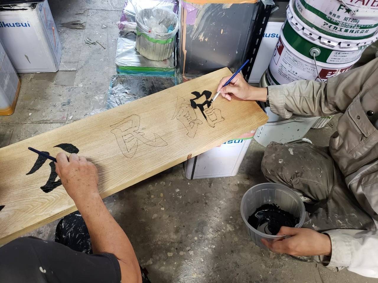 電動工具研磨 → 染み抜き → 研磨 → 文字入れ → 透明塗装3回塗り