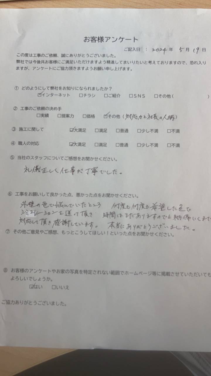 佐賀市柳町 S様邸外壁塗装工事 BIFORE カラーシミュレーション 外壁=アプリコット(アステック色見本) AFTER 外壁 : アステック フッ素REVO1000 色:アプリコット色 施工後 南面正面より撮影 施工後 南東面より撮影 お客様の声 外壁の色で悩んでおりましたが、何度も何度も希望した色でシミュレーションを送って頂き、納得いくまで対応していただき、感謝しております。 本当にありがとうございました。 担当者より 長期間お世話になりました。 瓦の葺き替え工事も併せてご注文いただき、誠にありがとうございました。 外壁の色ではかなりお悩みのようでございましたが、無事に納得のいく色が決まって、また、仕上がりも気に入っていただけて嬉しい限りです。 今後ともどうぞよろしくお願いいたします。