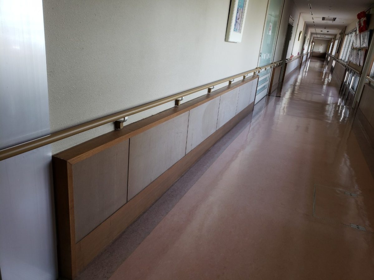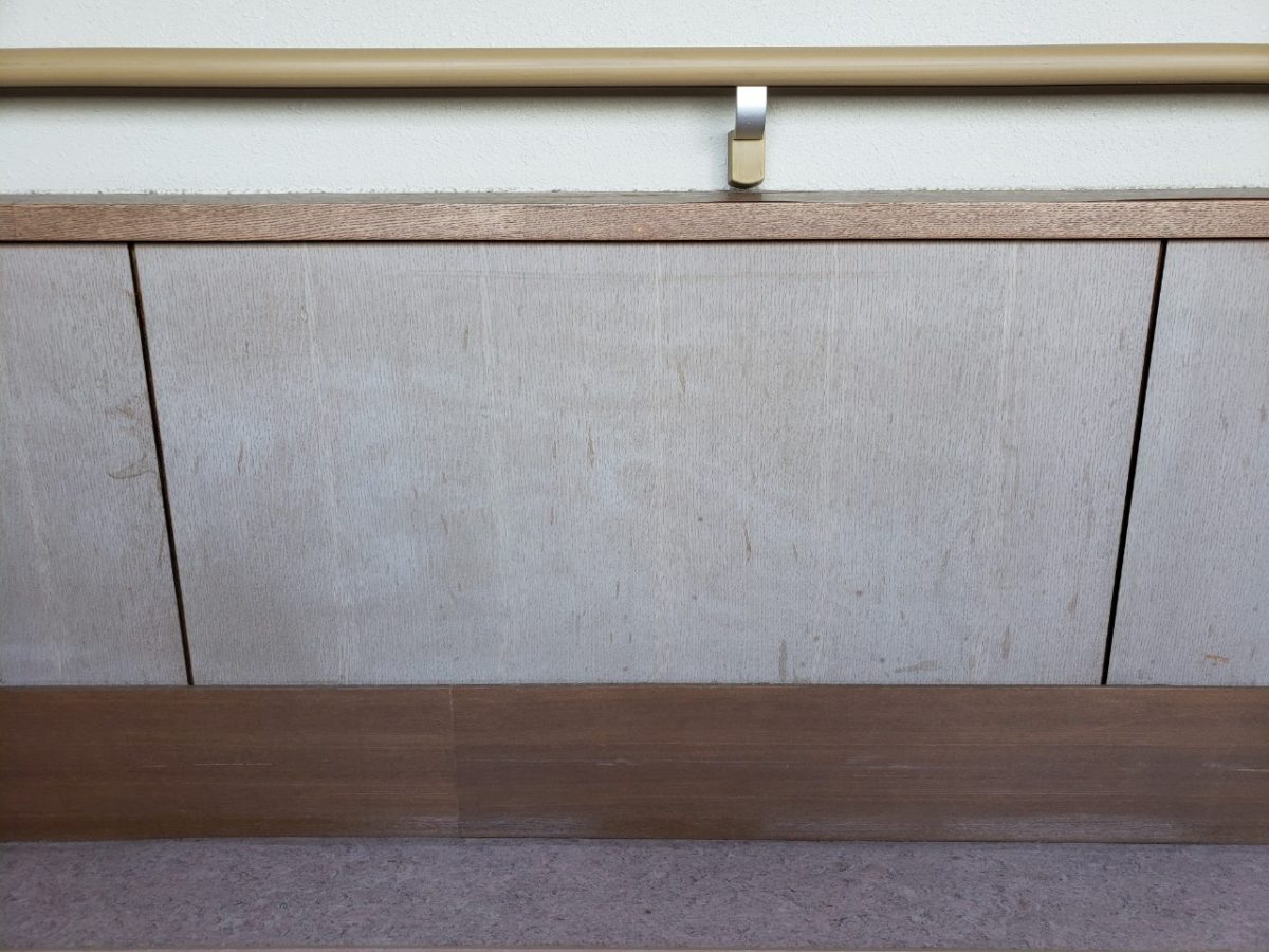 廊下の腰壁は白く変色してしまって表面の層が剥がれてきております。