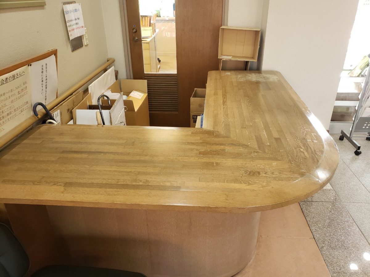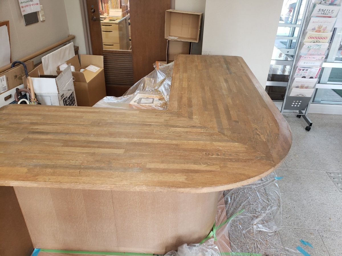 工事内容は各所のカウンターと廊下の腰壁の塗装塗り直しです。