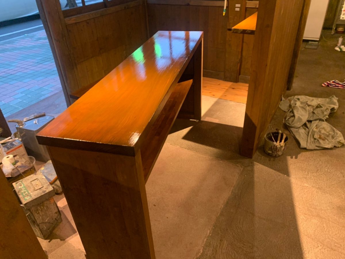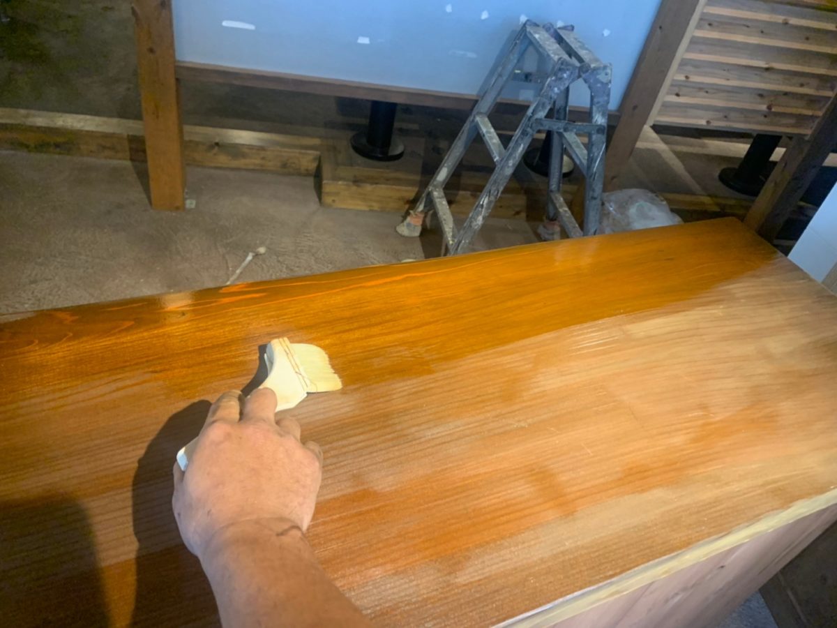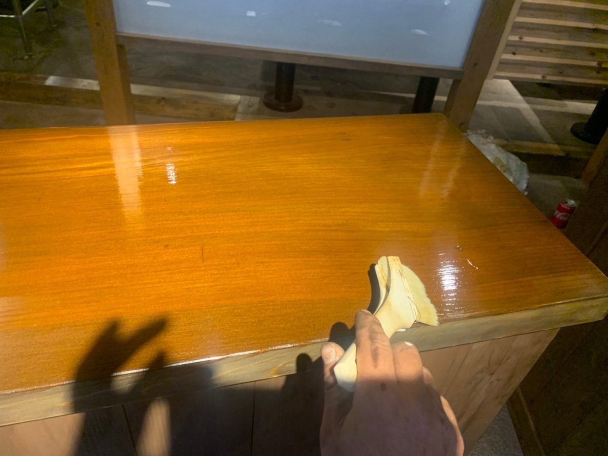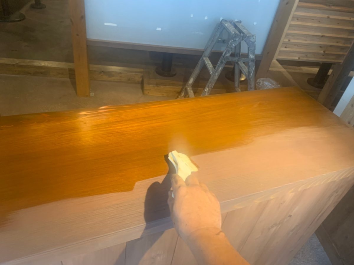 壁等はこれで終了とのことですが、カウンターは汚れ防止のため例によってクリアー塗装を施していきます。