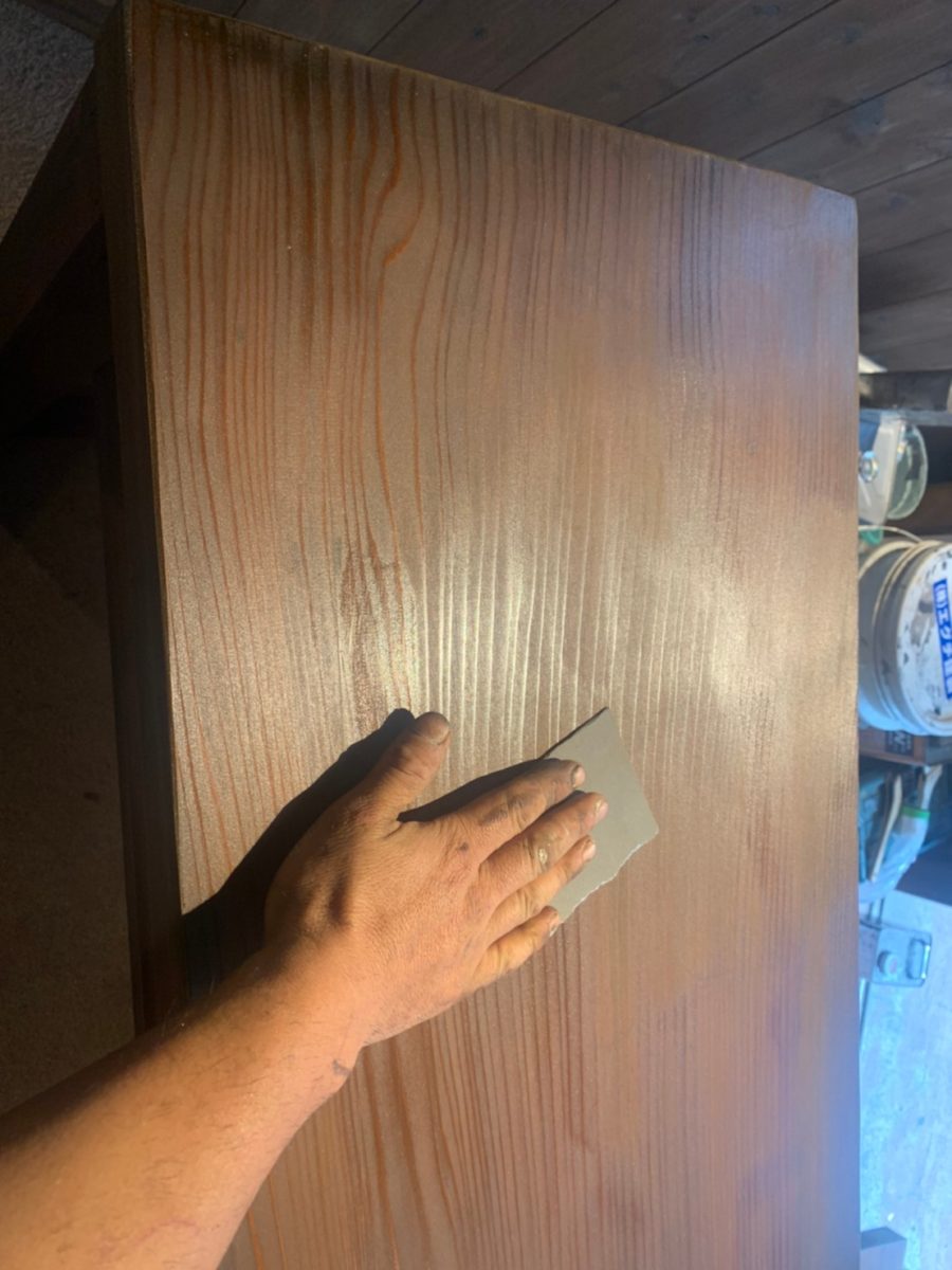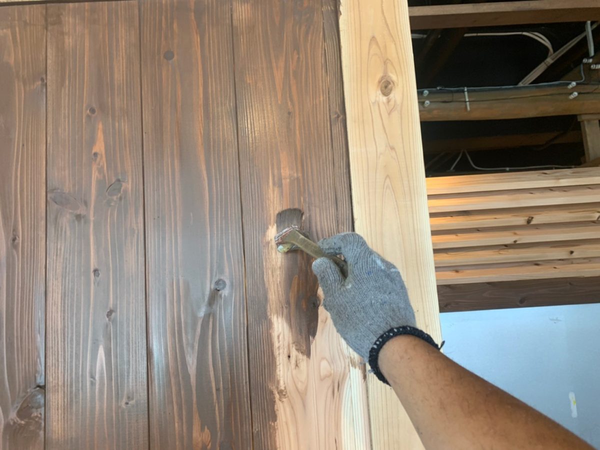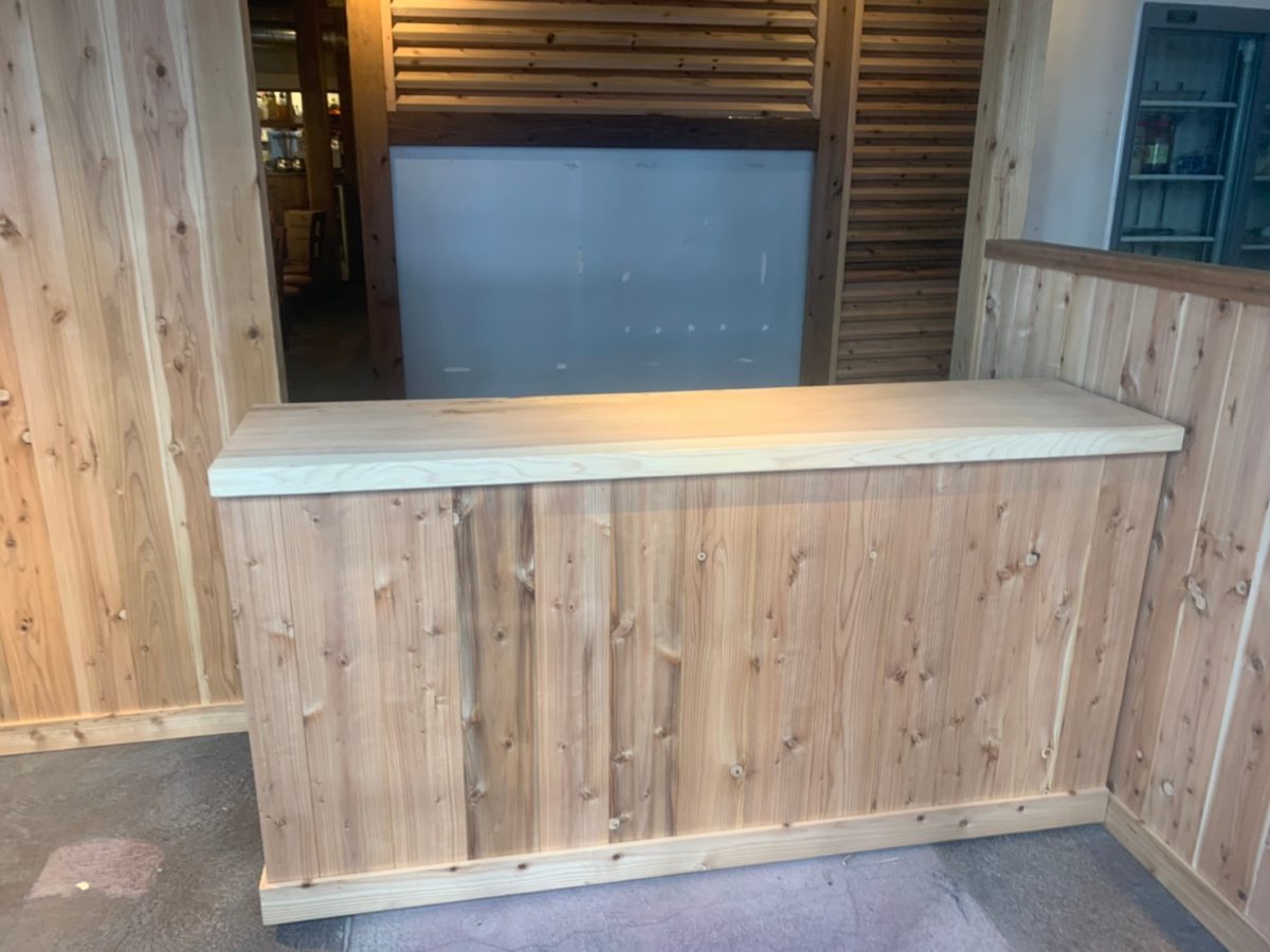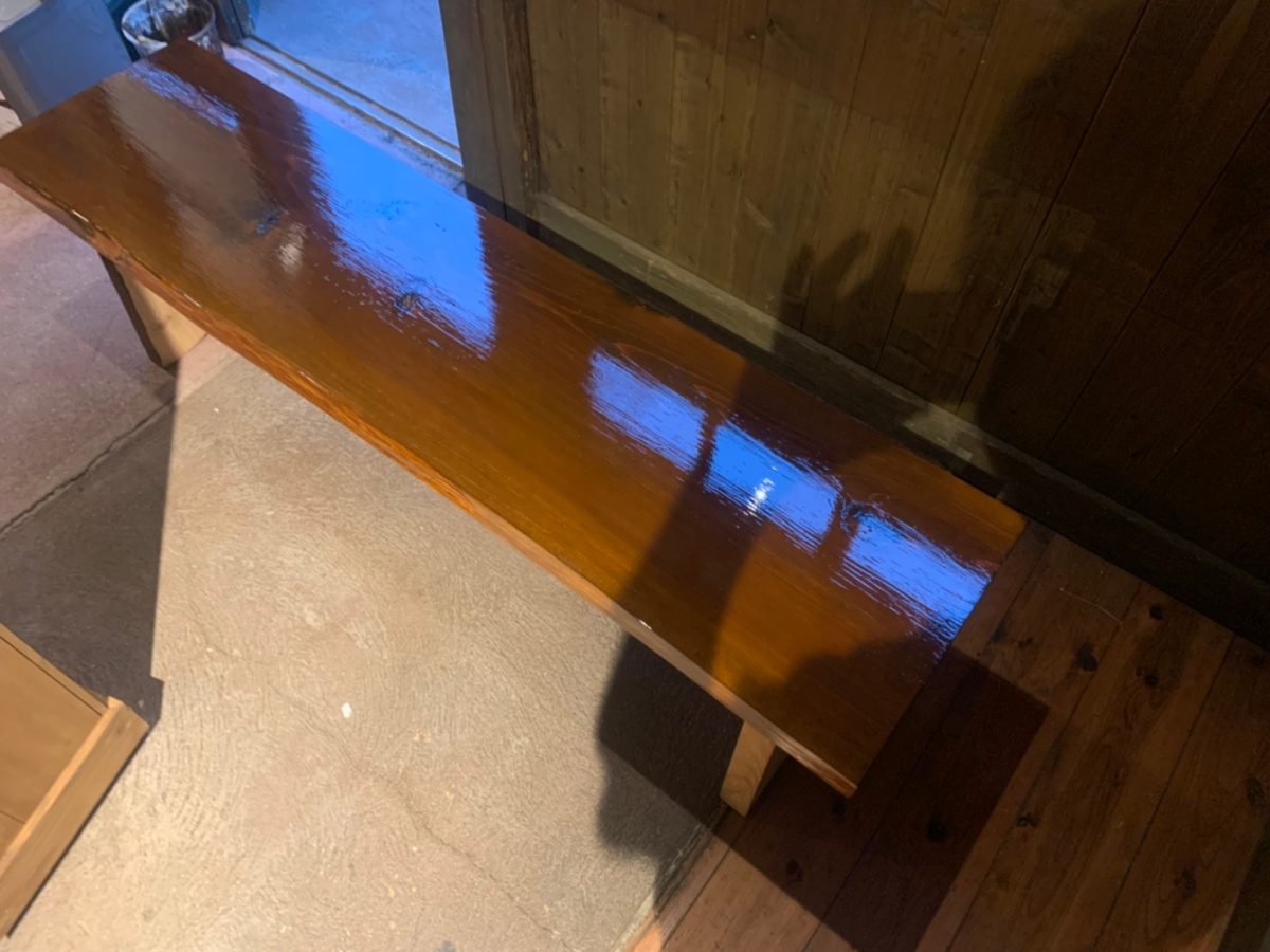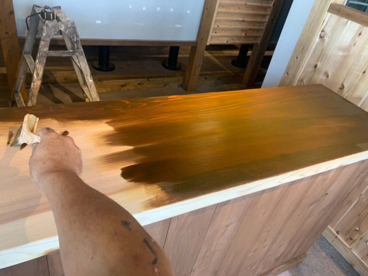 壁等はこれで終了とのことですが、カウンターは汚れ防止のため例によってクリアー塗装を施していきます。