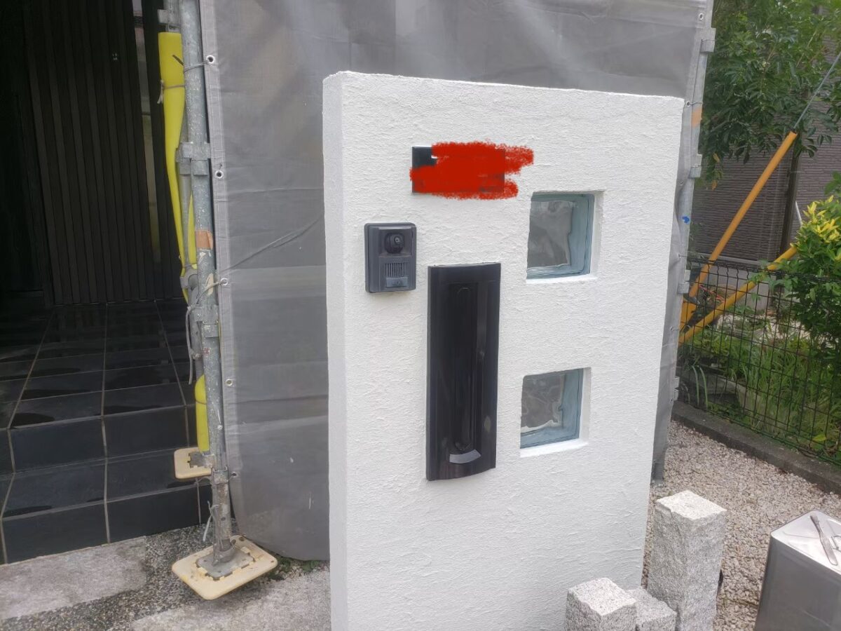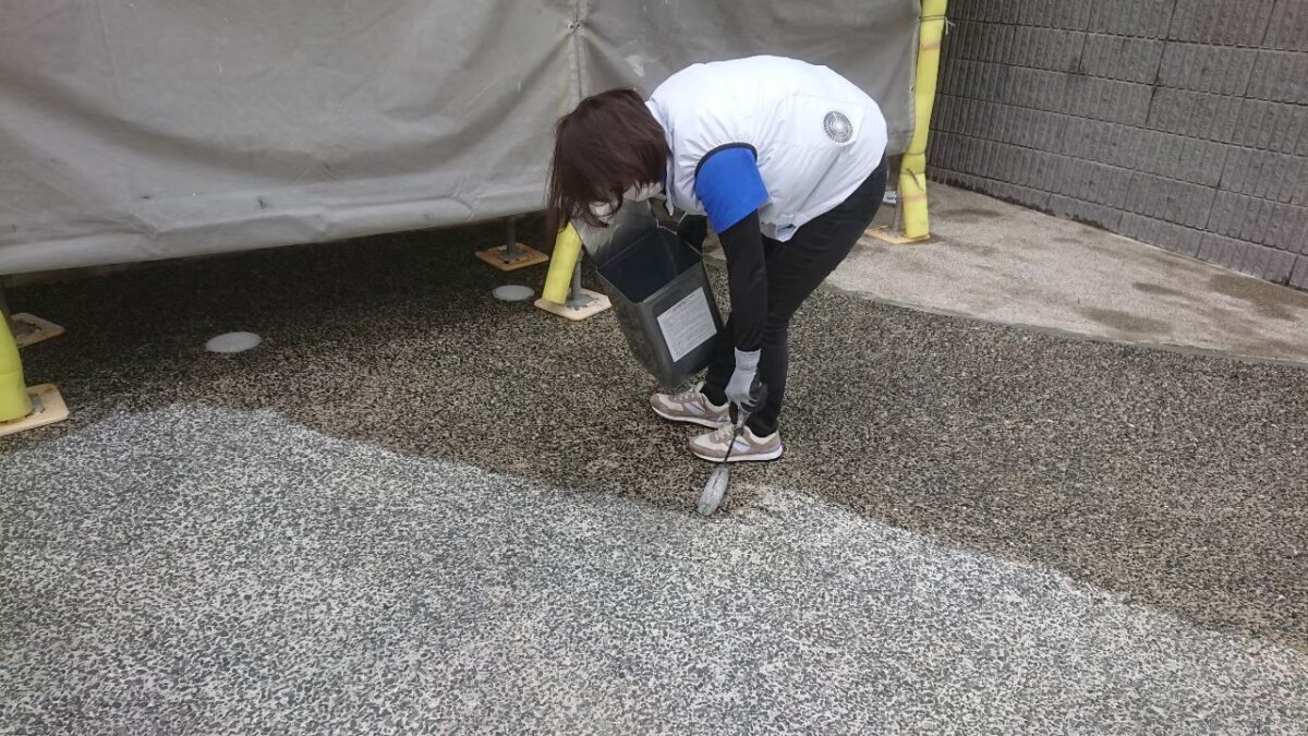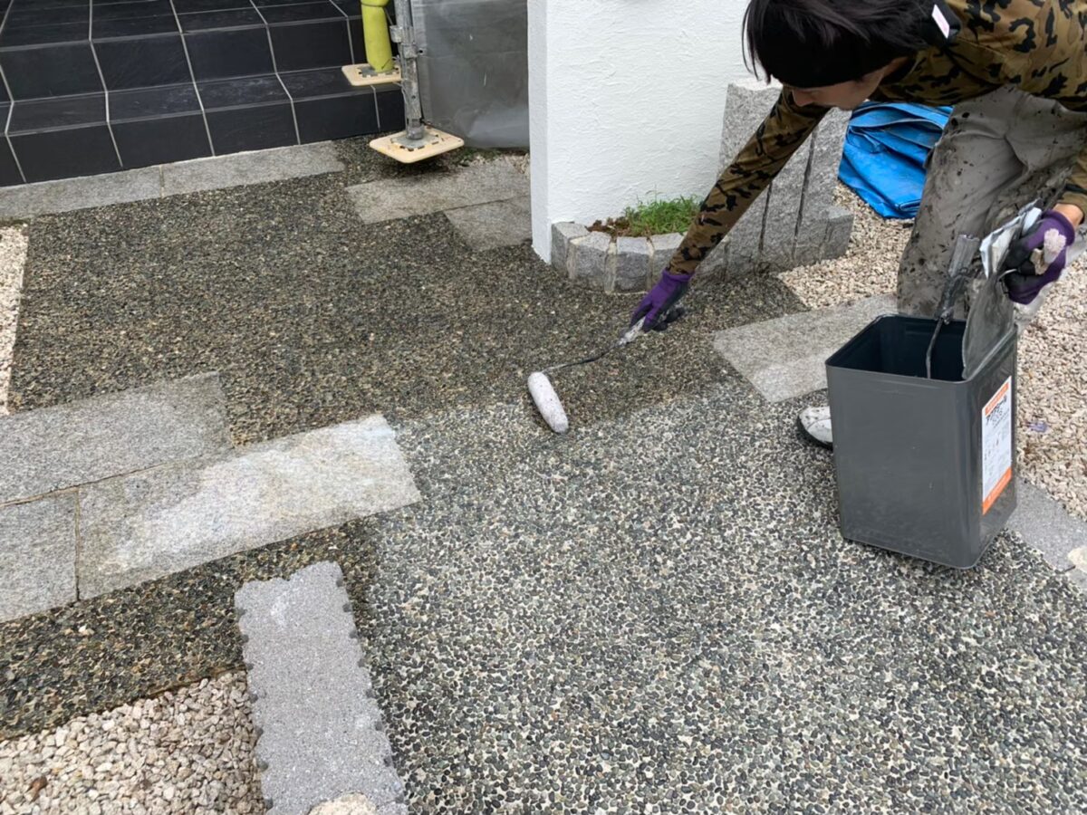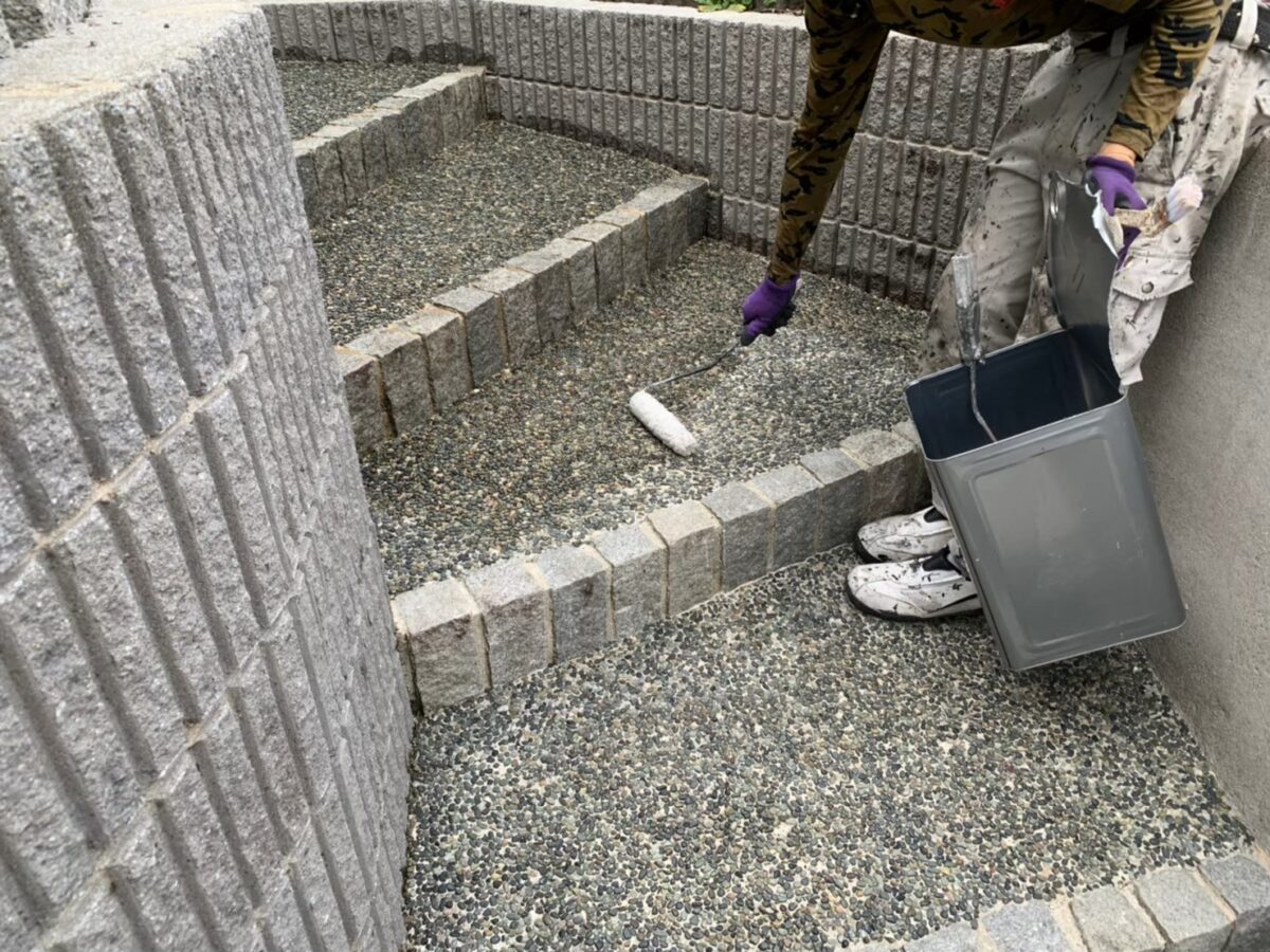先ずは玄関前の床の土間や石柱、階段や塀、駐車場の床等に浸透撥水剤を塗布していきます。