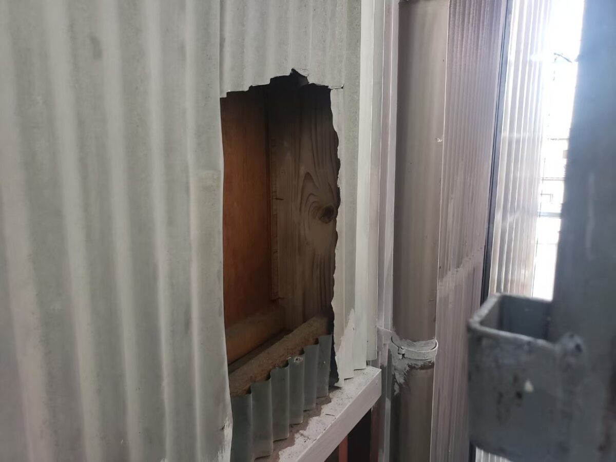 それとトタン壁が外れている箇所に金属製波板を張ります。
