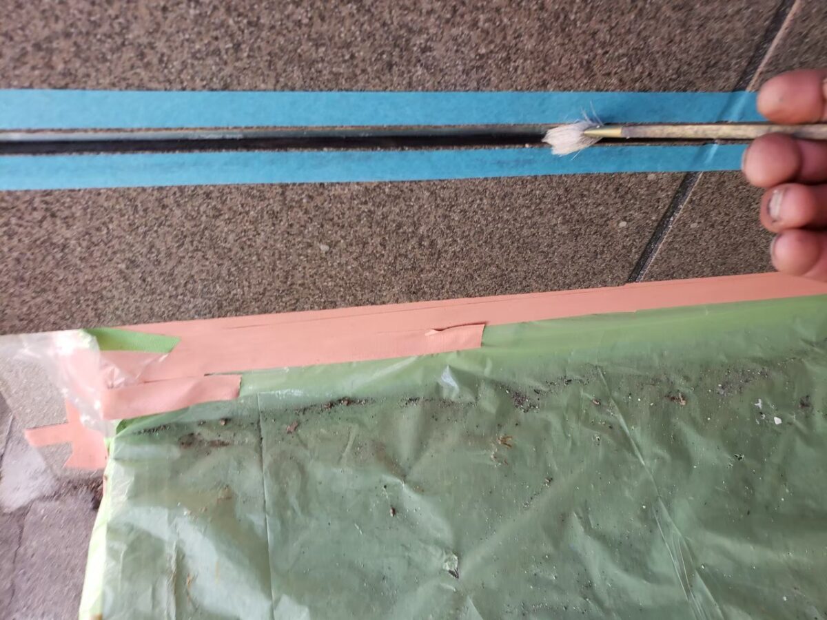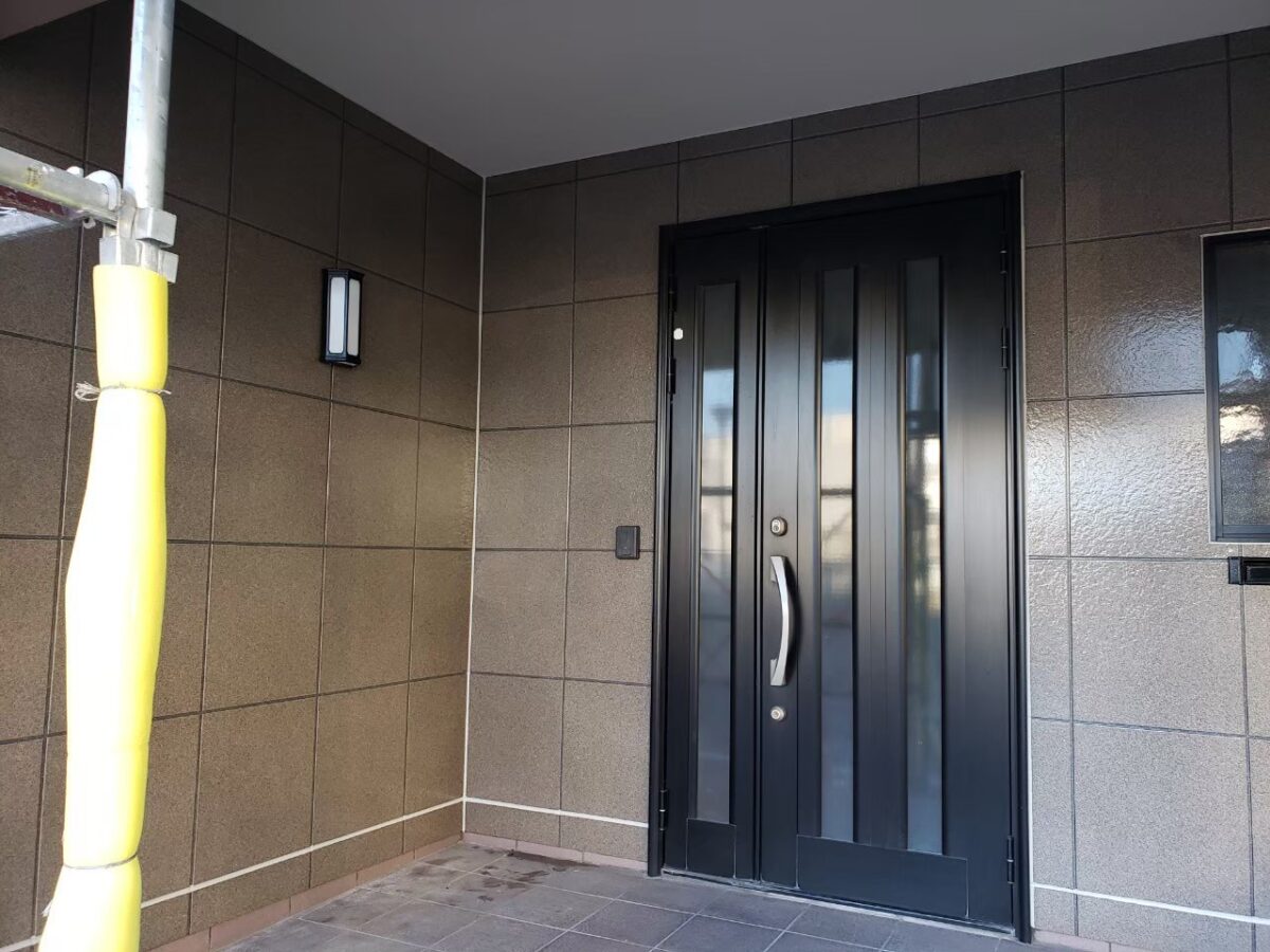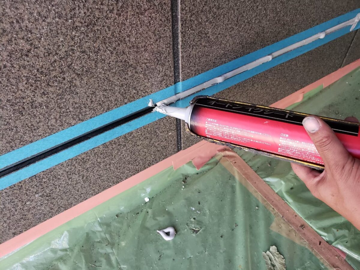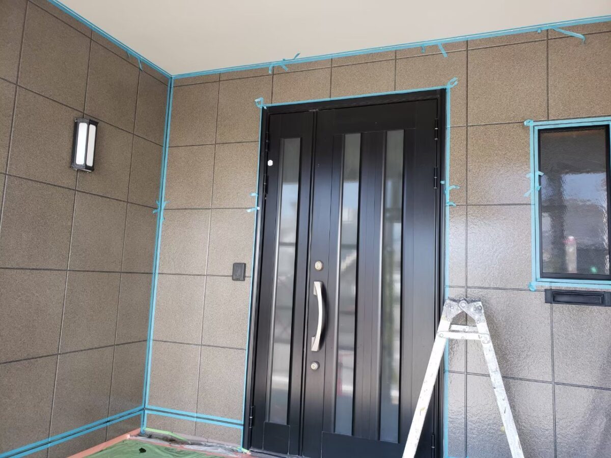 同時並行で玄関前外壁のシーリング工事状況です。