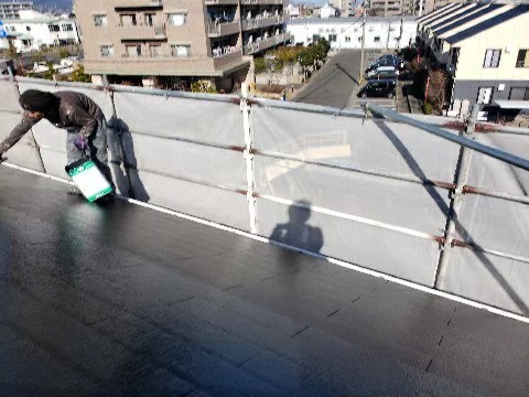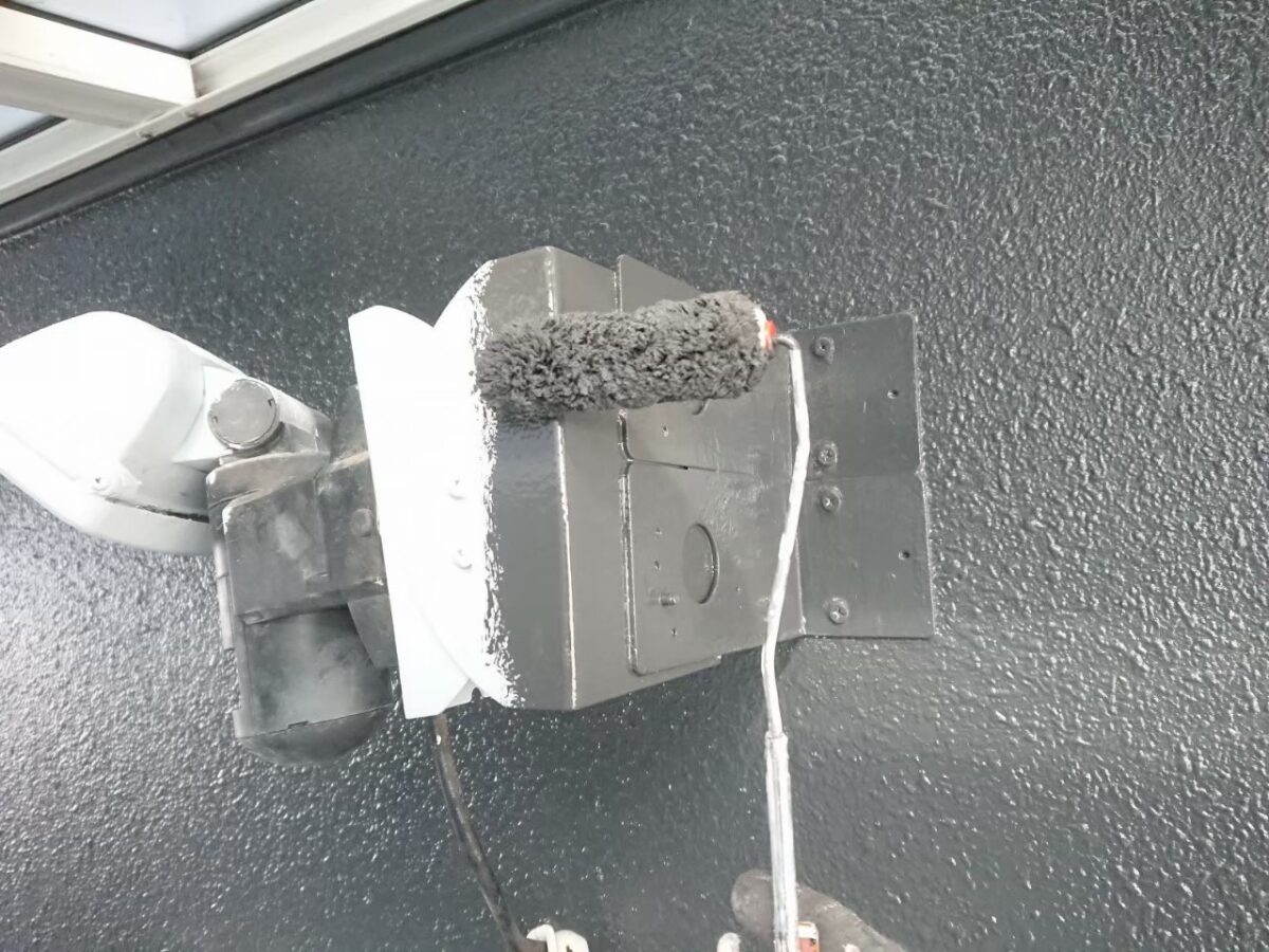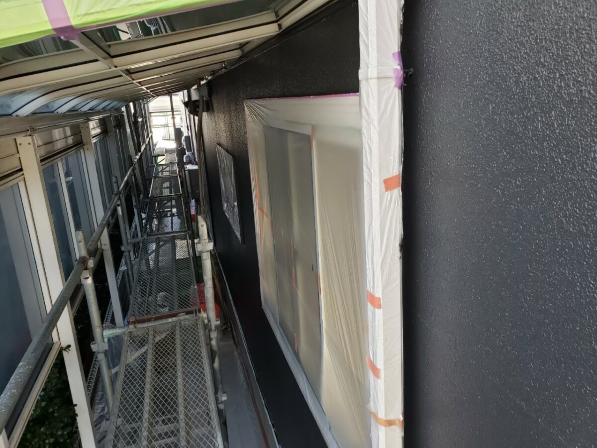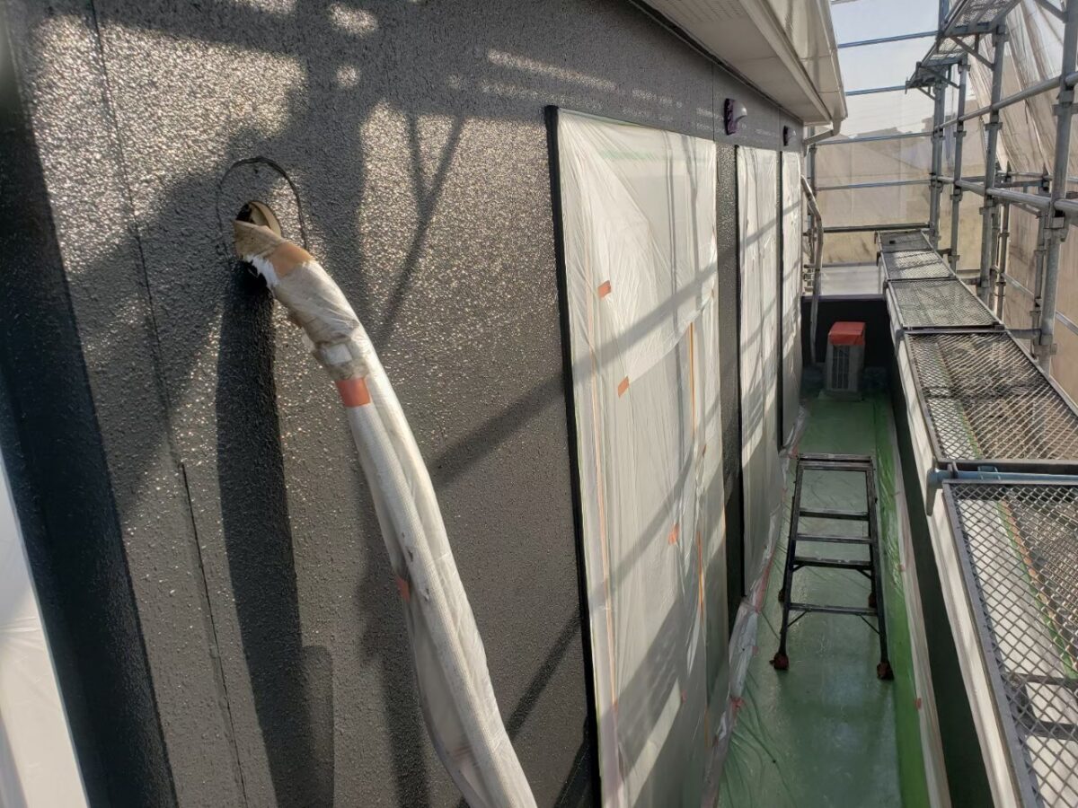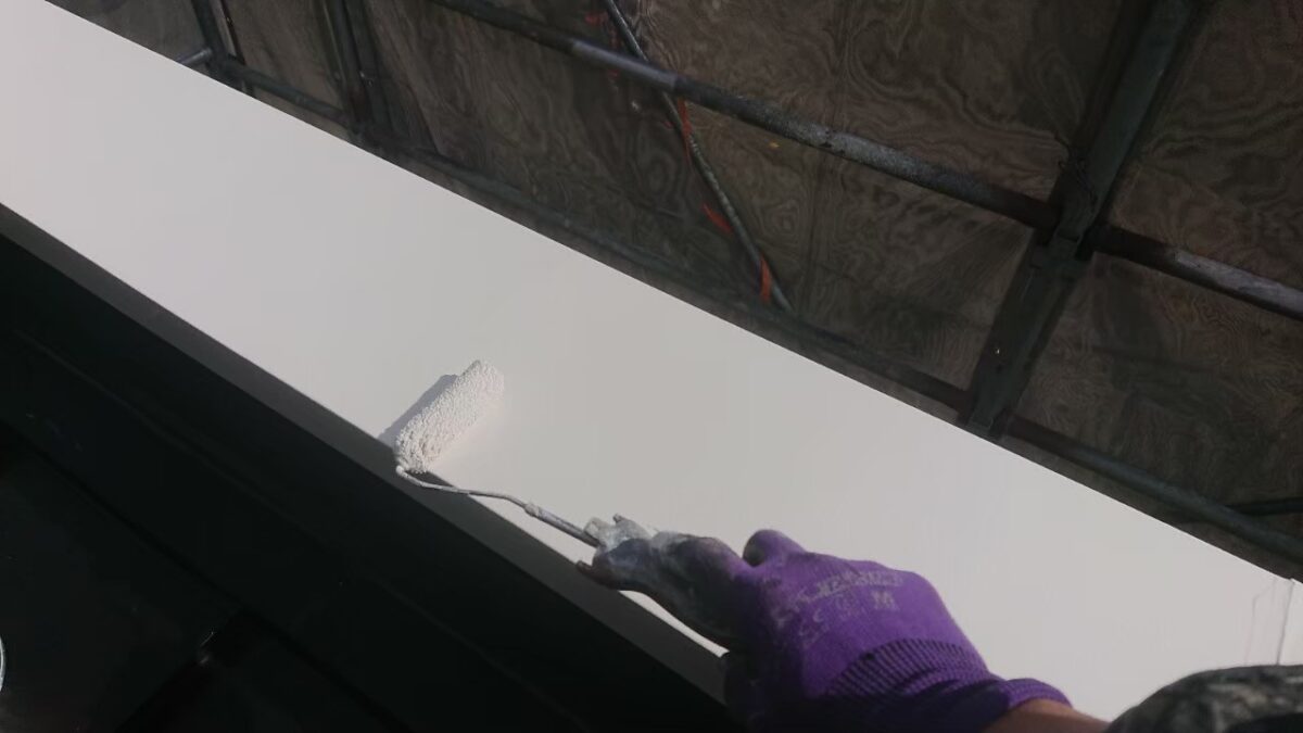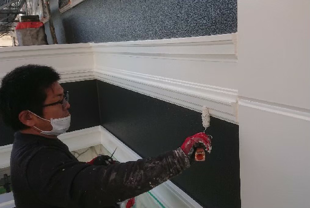 外壁塗装の下塗り時に下塗りは施しているので、中塗りから始めていきます。