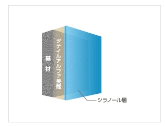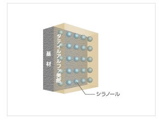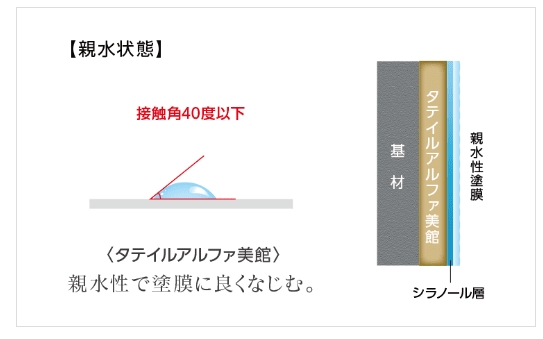 タテイルα美観は、塗膜の表層にシラノール層を形成することで親水性塗膜となります。
