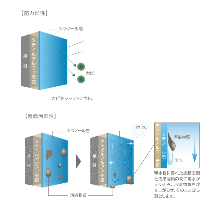 雨で汚れを流し落とすハイドロクリーニング効果と、防藻・防カビ効果も発揮します。