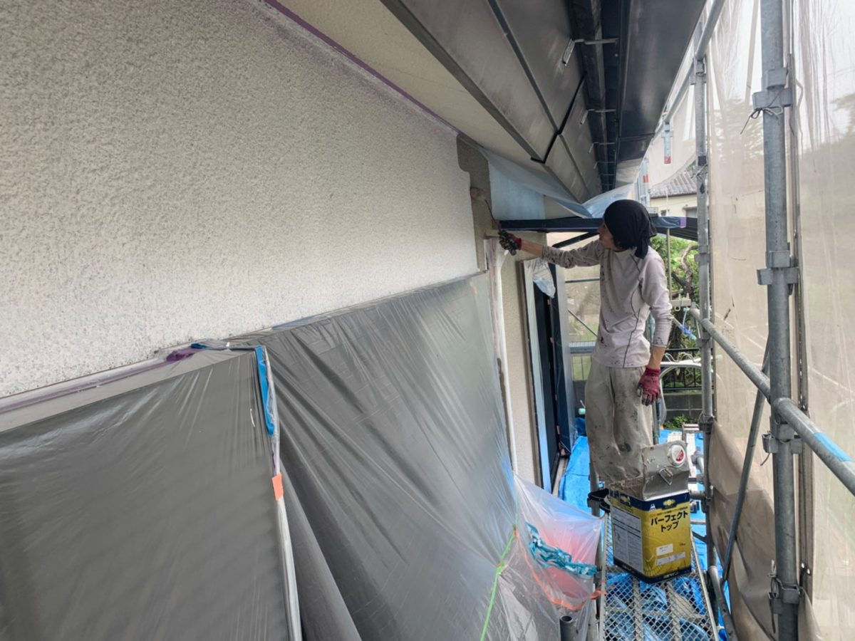 本日は屋根の下塗りと外壁の中塗りをやっていきます。