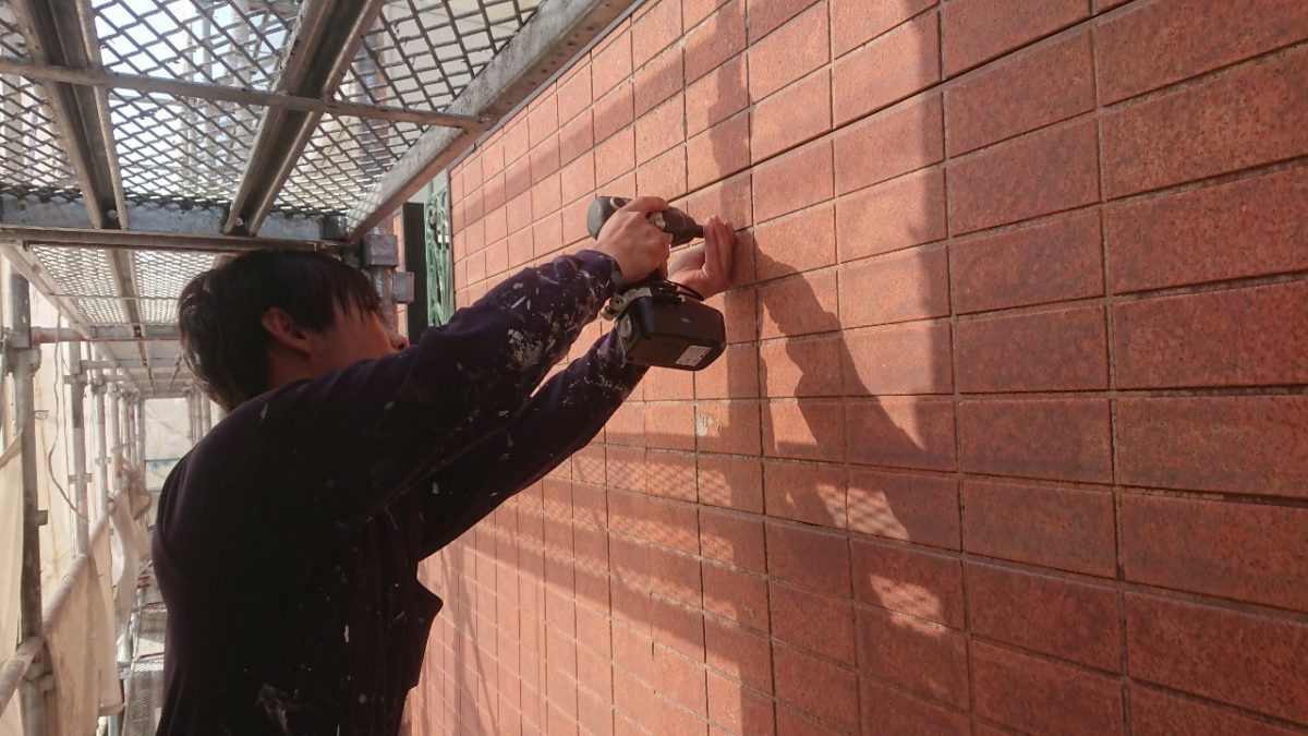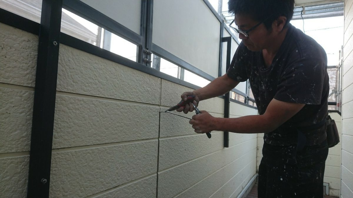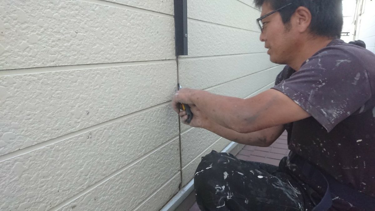 洗浄が終わった箇所から下地処理の一環で既存シーリングの撤去作業です。