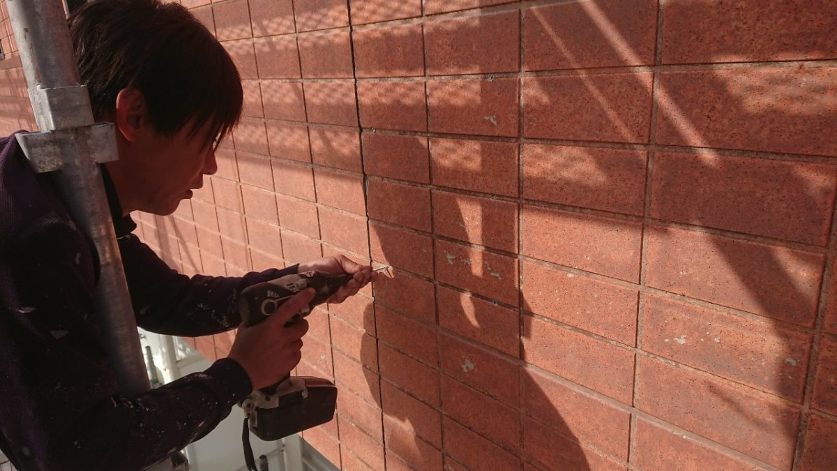 更に同時並行で外壁が浮いている部分をビスにて打ち込んで不陸調整です。