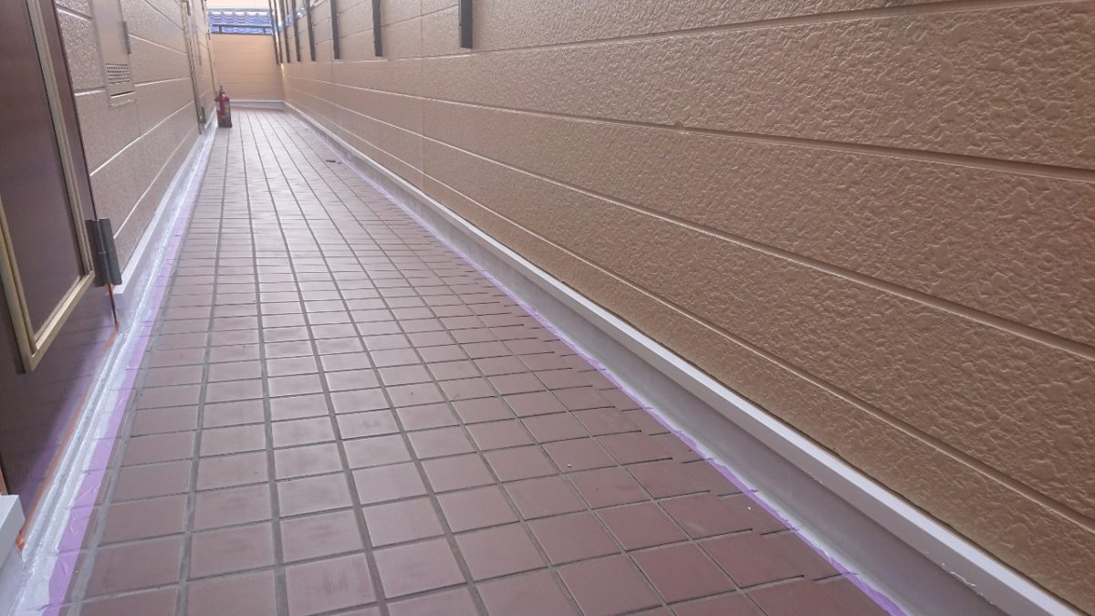 それと二階供用通路のコンクリート立ち上がり部からの浸水が僅かながらあるようでしたので、サービス工事にはなりますが、塗っていきます。