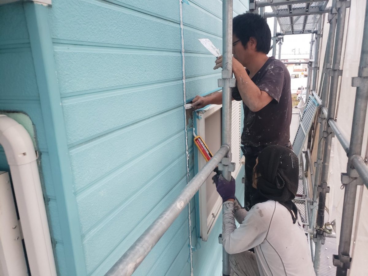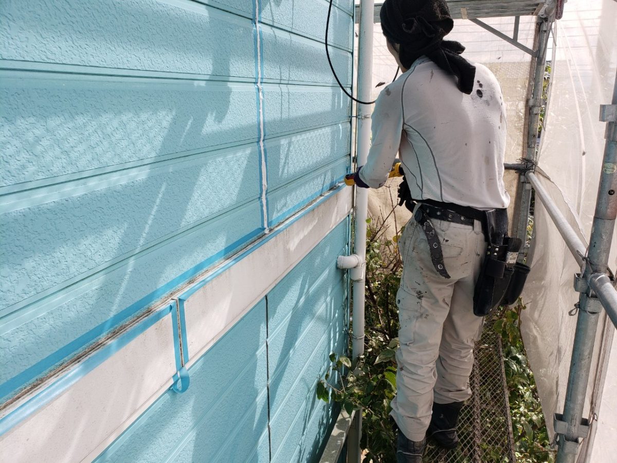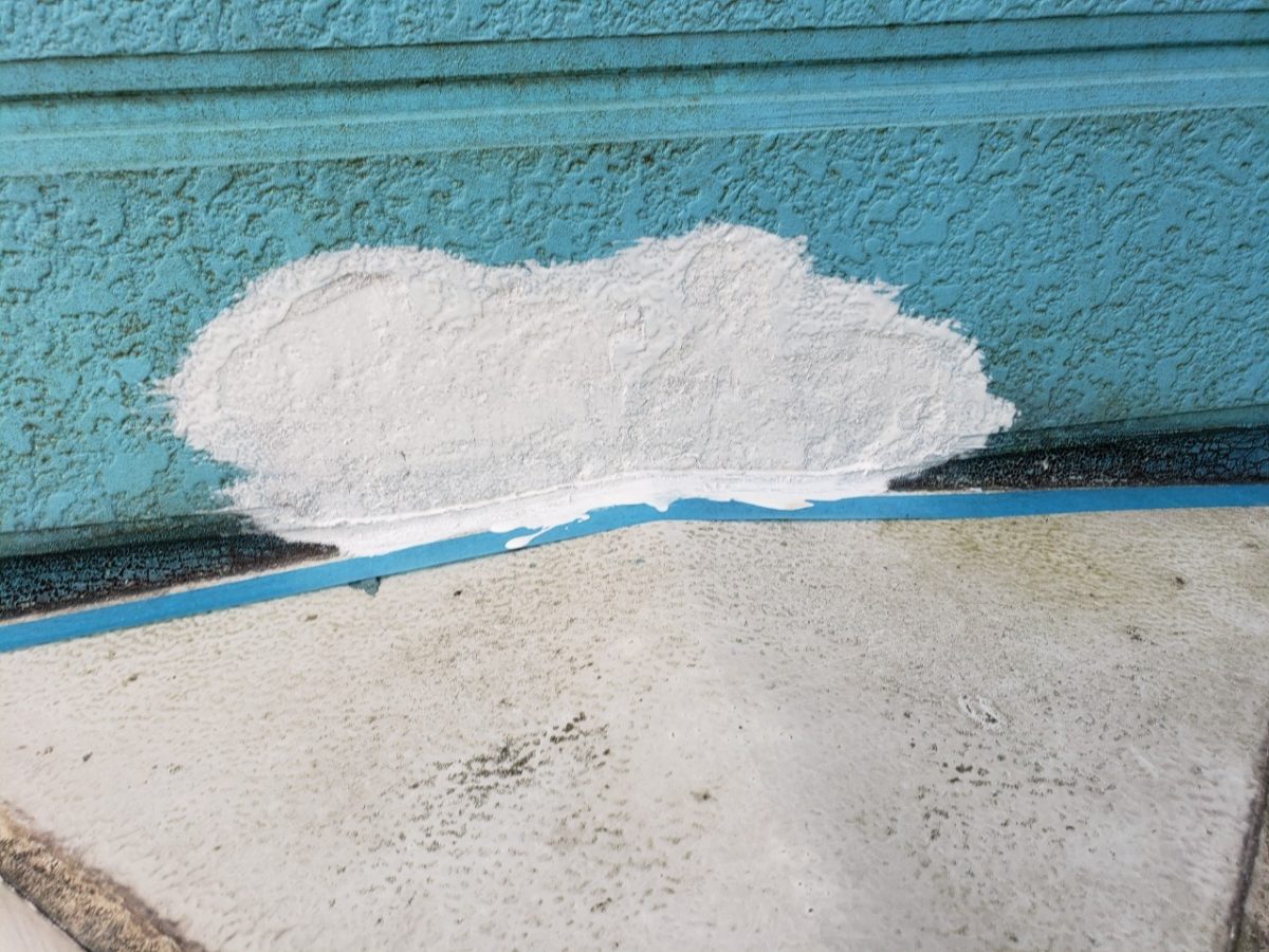 通常ですと最初に高圧洗浄なんですが外壁からの水漏れが半端ないことが最初の調査で解ってますので、まずは下地処理と外壁浮き部の研磨、シーリングの打ち替えを先に行っていきます。