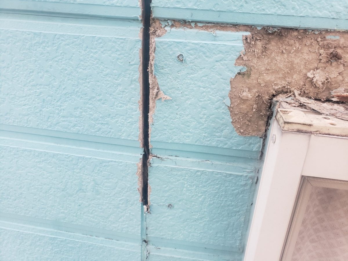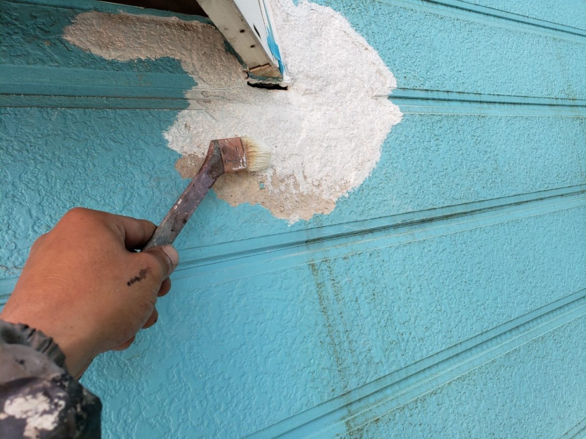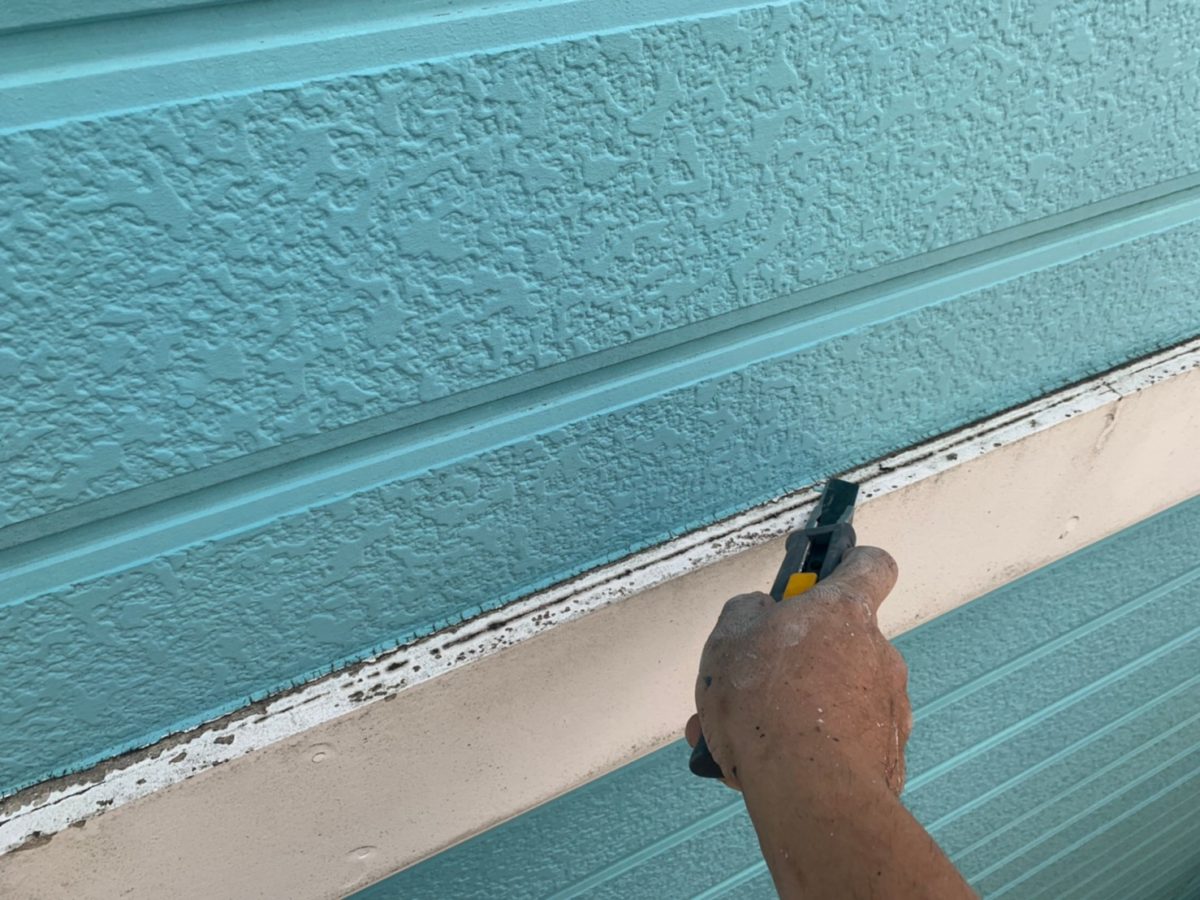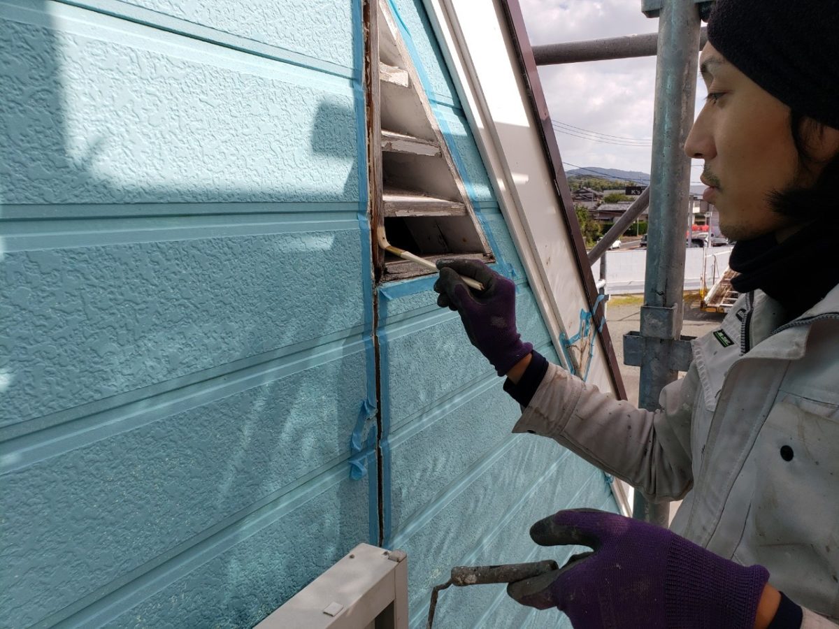 通常ですと最初に高圧洗浄なんですが外壁からの水漏れが半端ないことが最初の調査で解ってますので、まずは下地処理と外壁浮き部の研磨、シーリングの打ち替えを先に行っていきます。