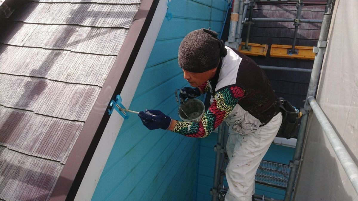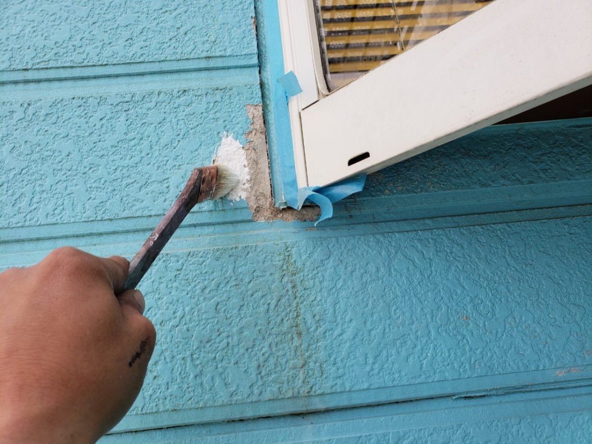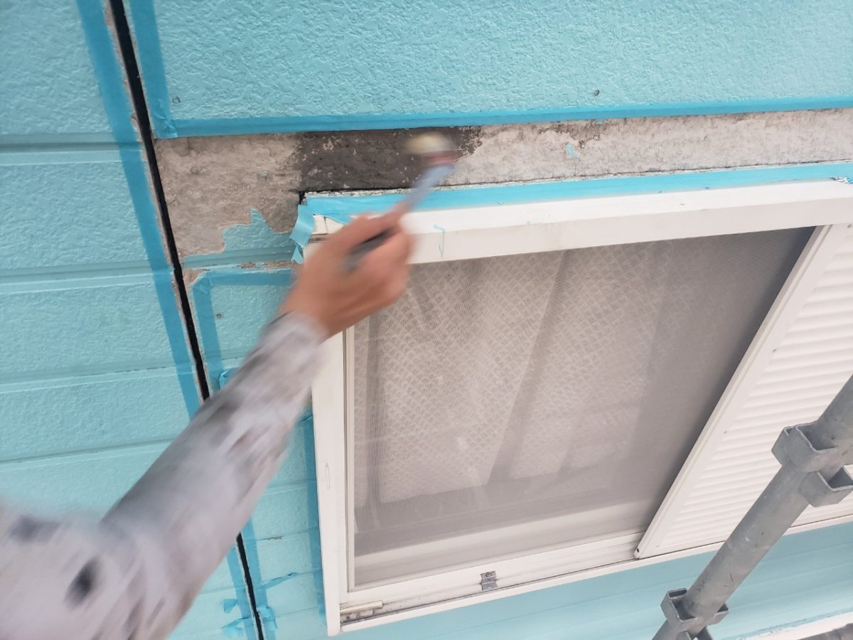 外壁の研磨した部分にエポキシ樹脂系の浸透造膜下塗り材を塗布します。