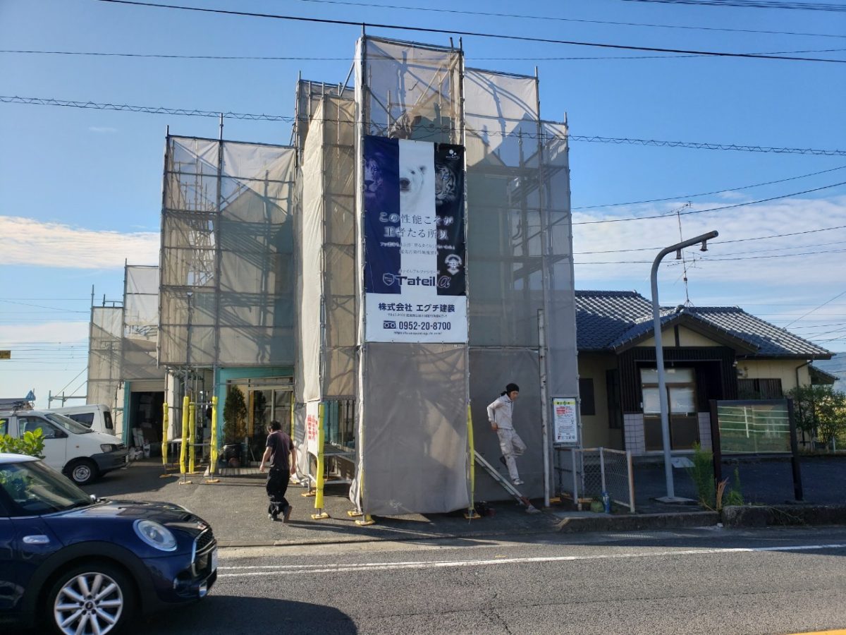 こんにちは。また新たにご契約いただきました物件で大町町のM花店様の外部塗装工事です。