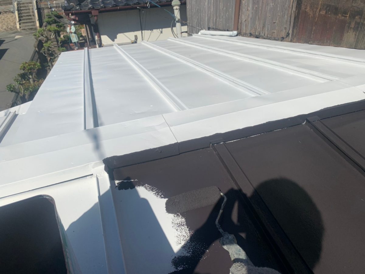 トタン屋根塗装中塗りです。