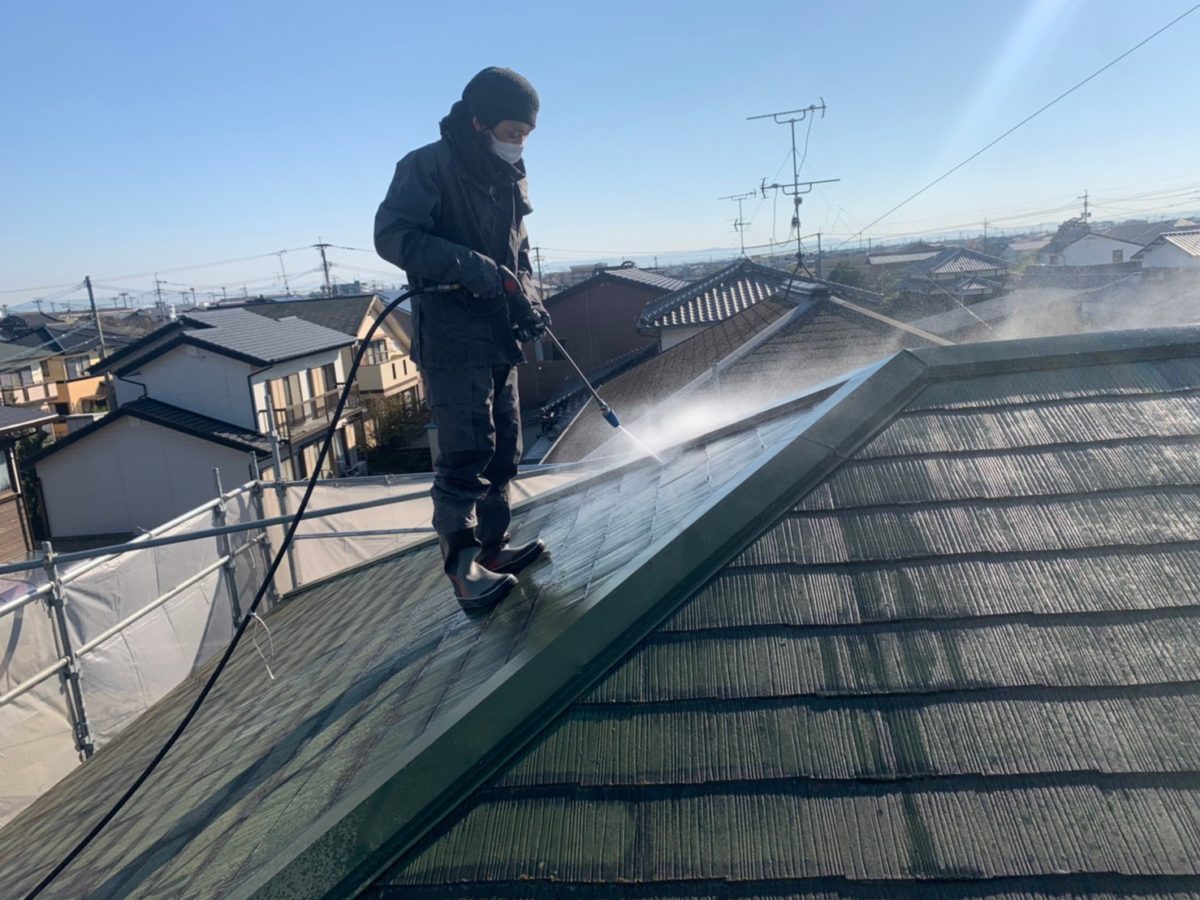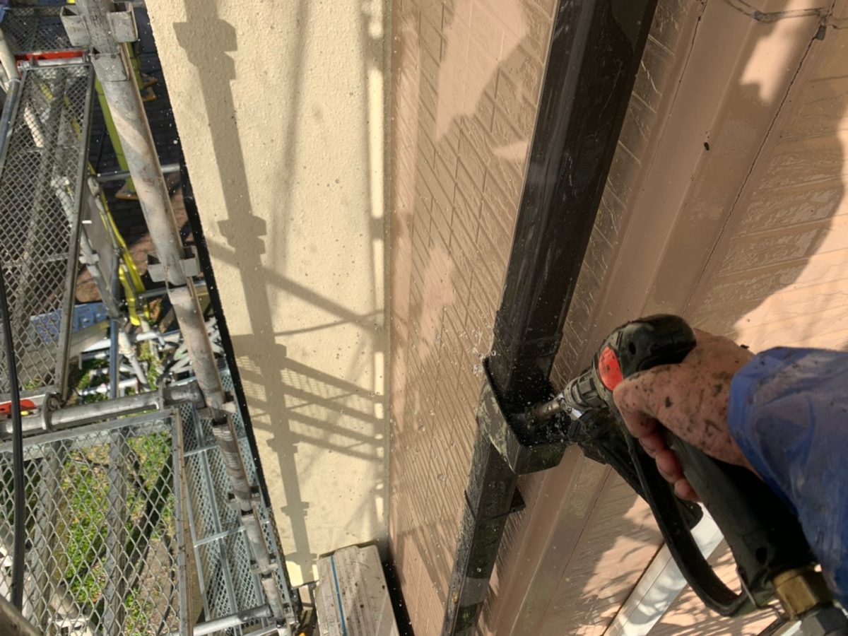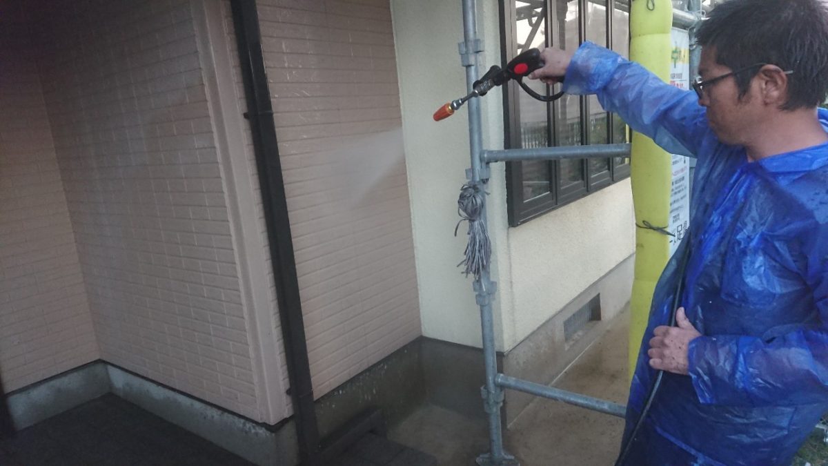 足場組み立ての翌日には高圧洗浄です。