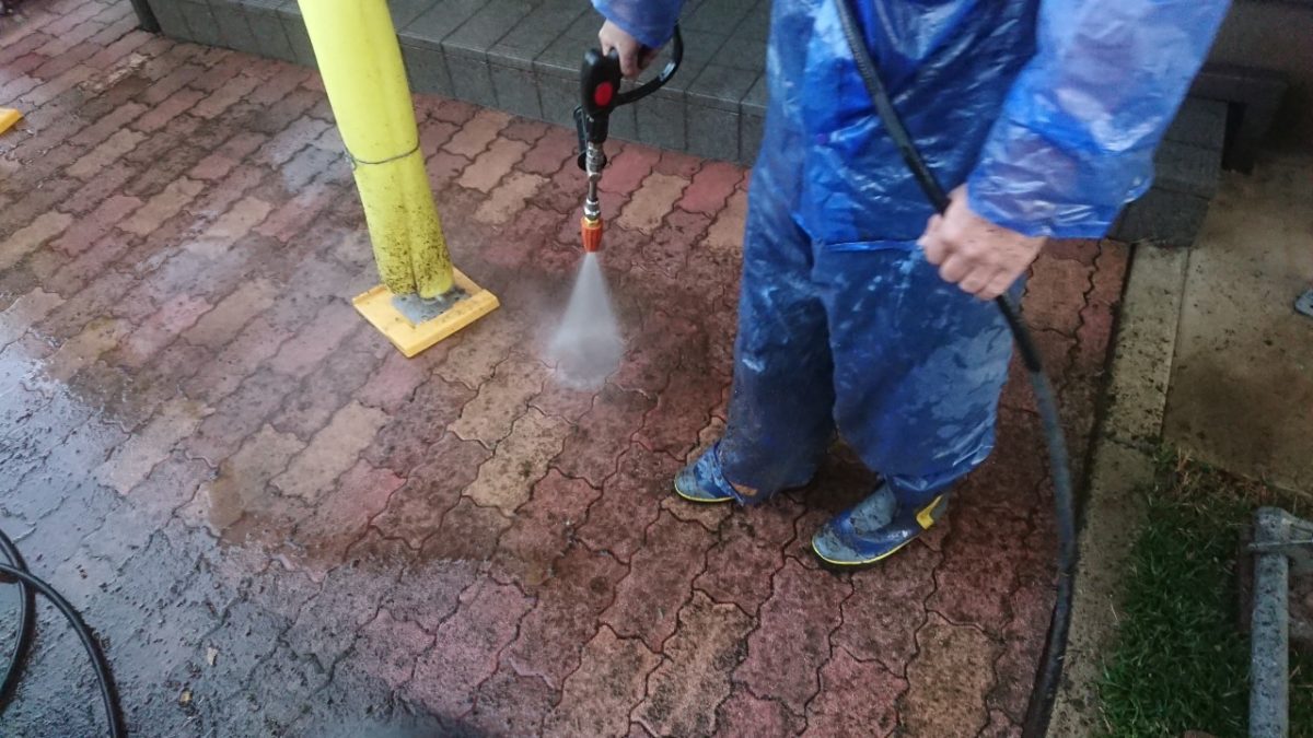 最後に玄関へのアプローチ部分の床も洗浄していきます。