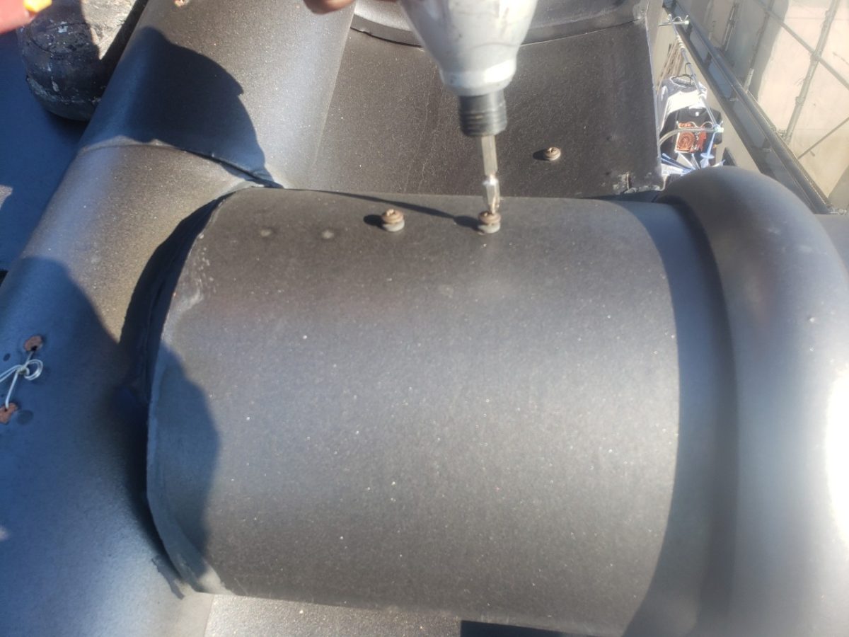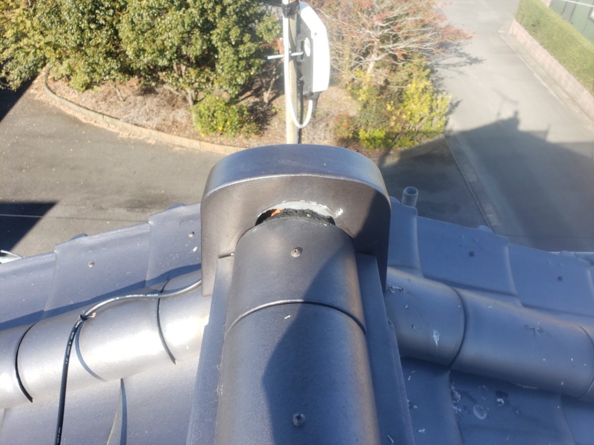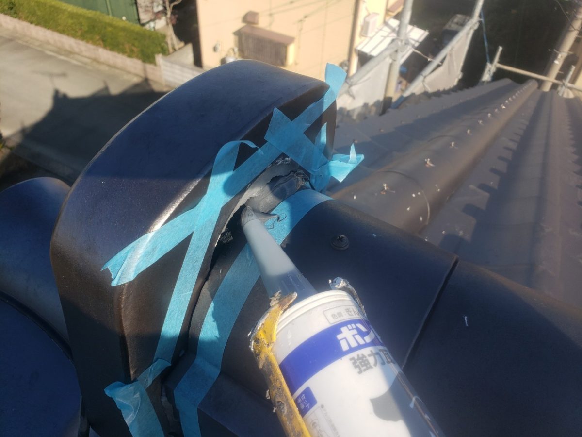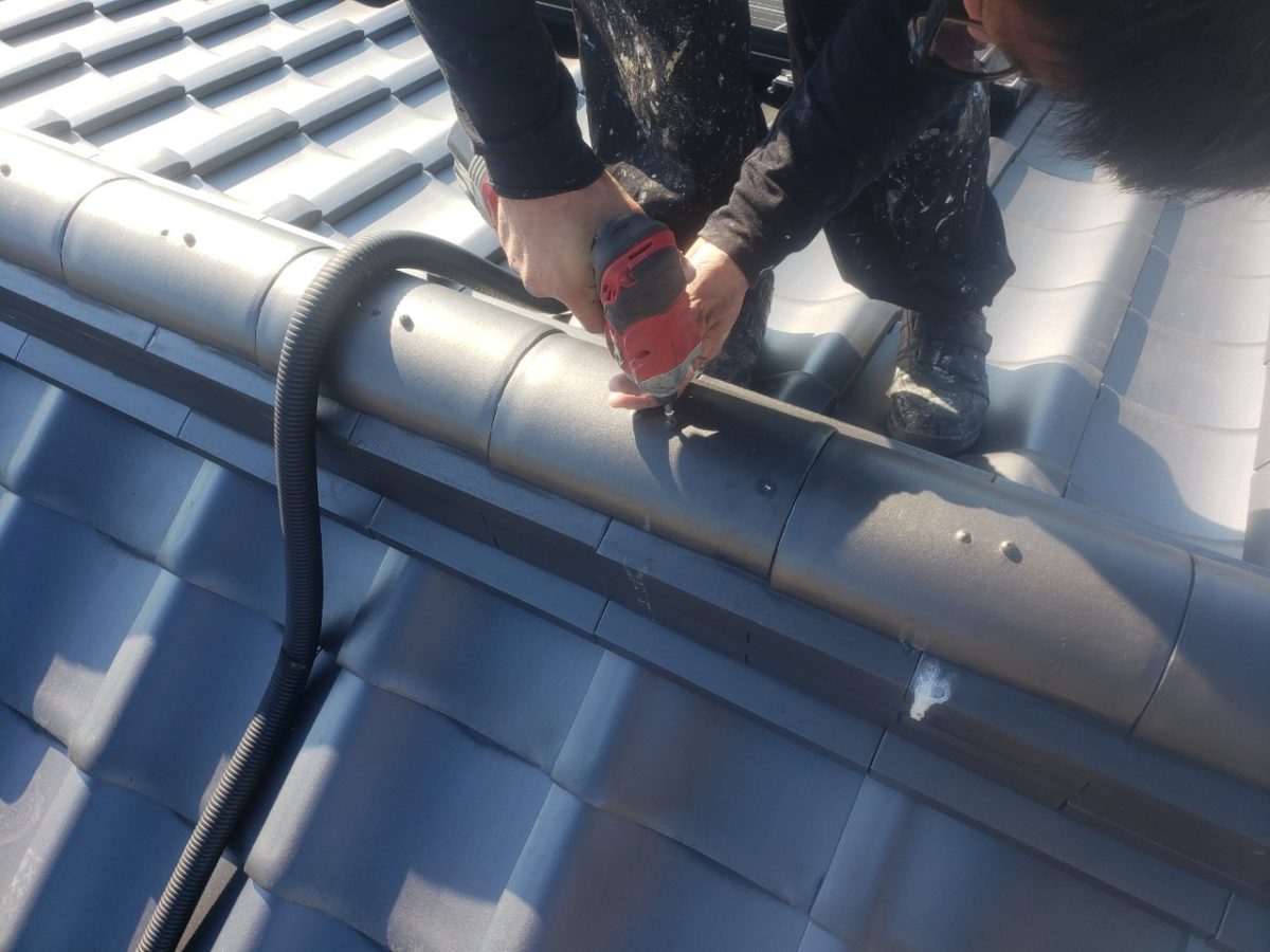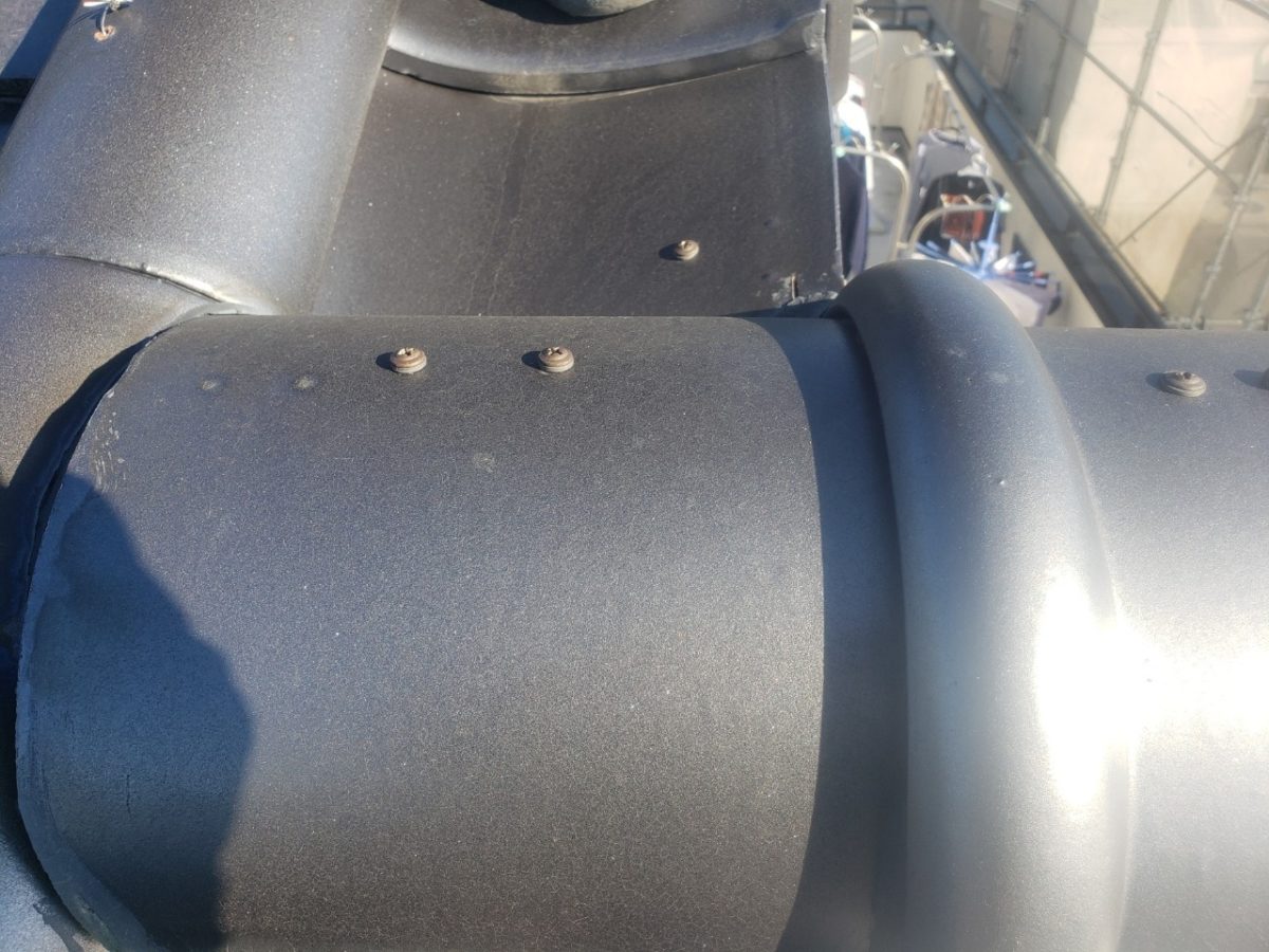 見積もり点検時に発見しておりました袖瓦、棟瓦のネジの緩みと鬼瓦の裏のシーリング破損がございますので、そちらを修繕していきます。