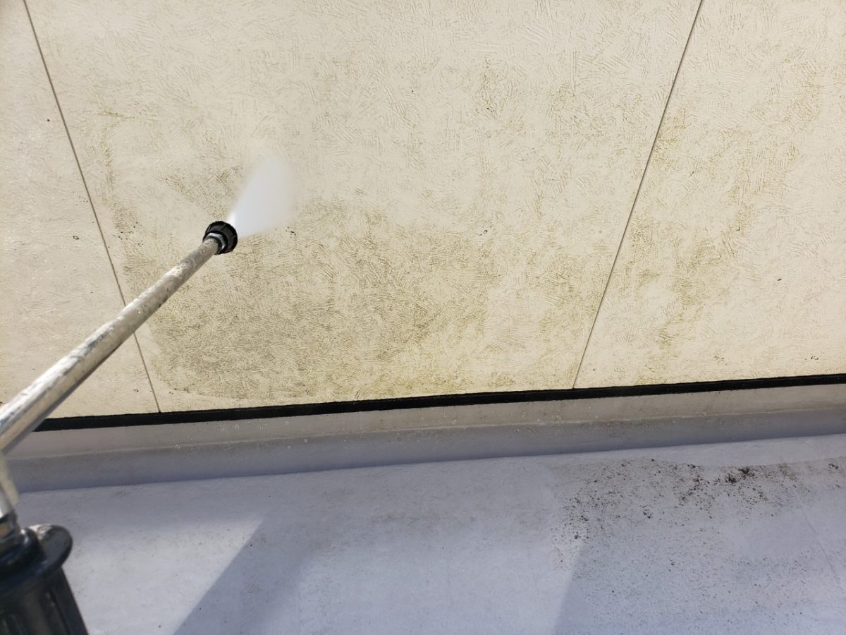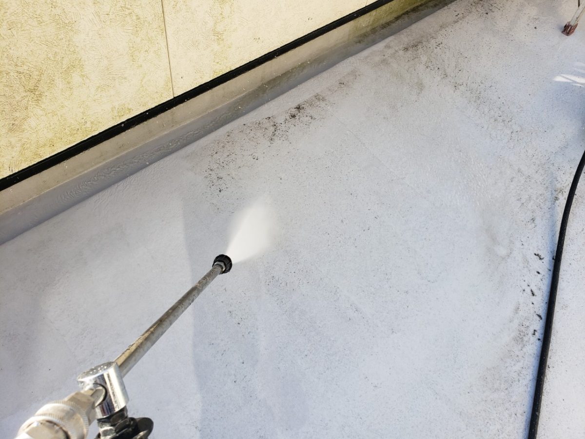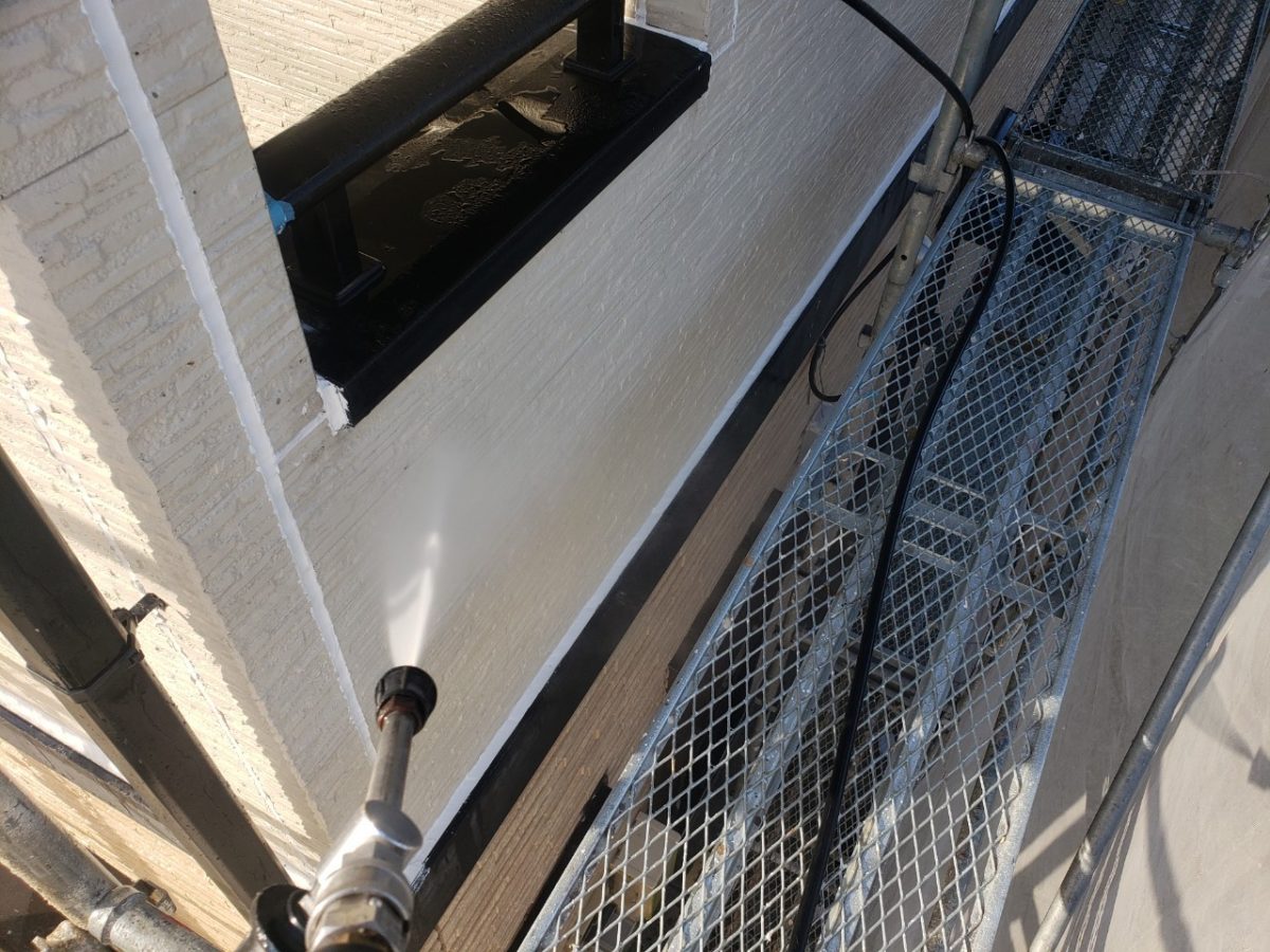 前日2階のシーリングを終わらせて漏水が無い状態にしてからの高圧洗浄、やっていきます。