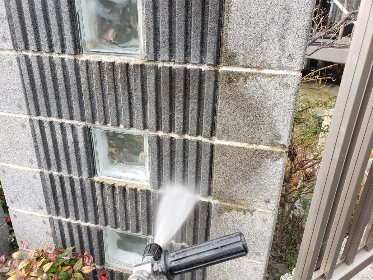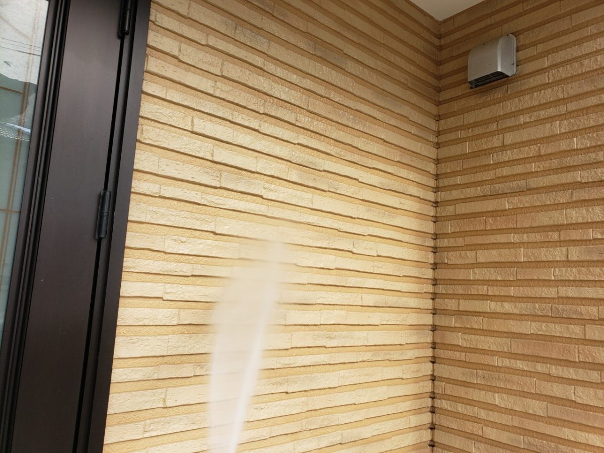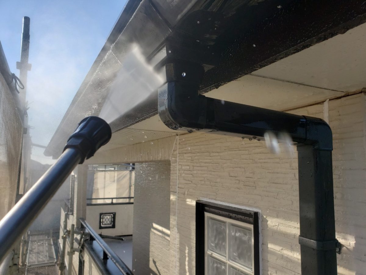 前日2階のシーリングを終わらせて漏水が無い状態にしてからの高圧洗浄、やっていきます。