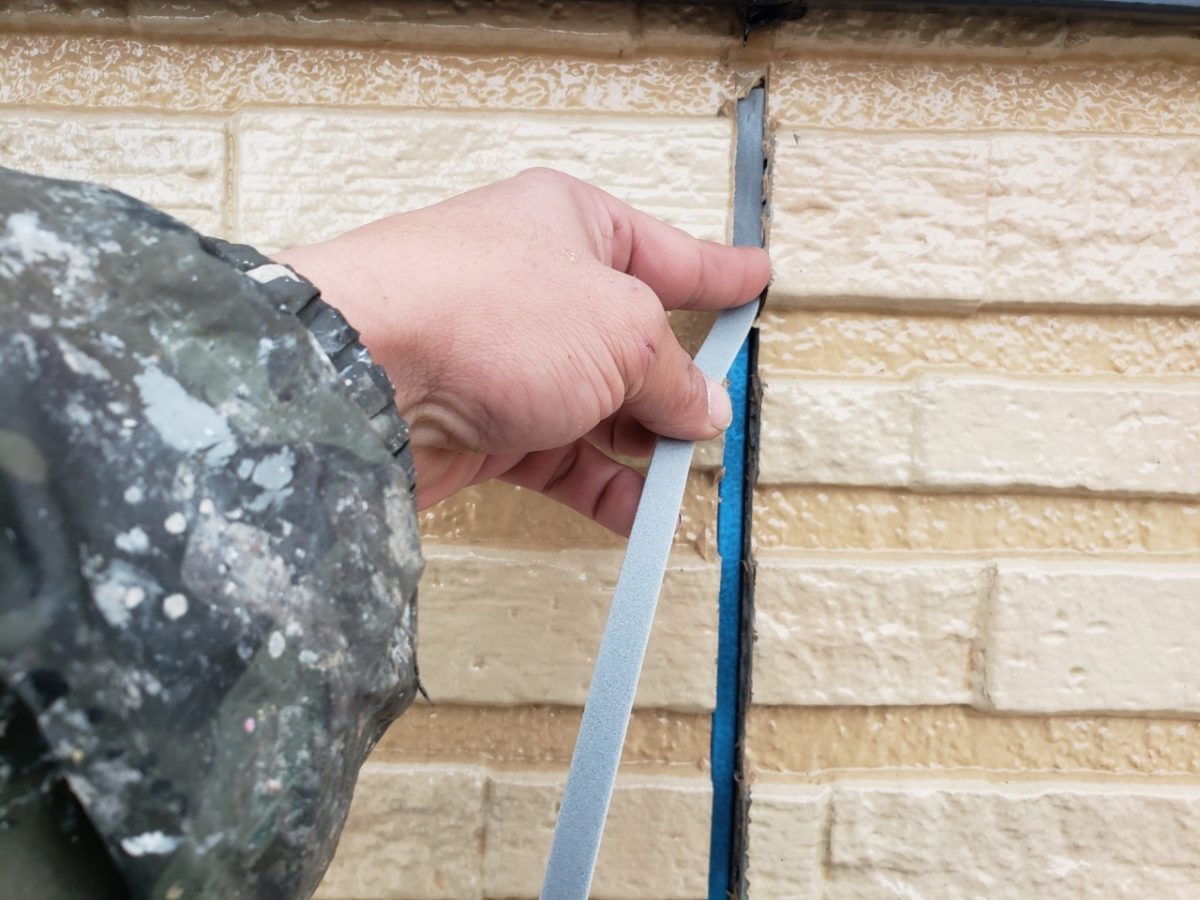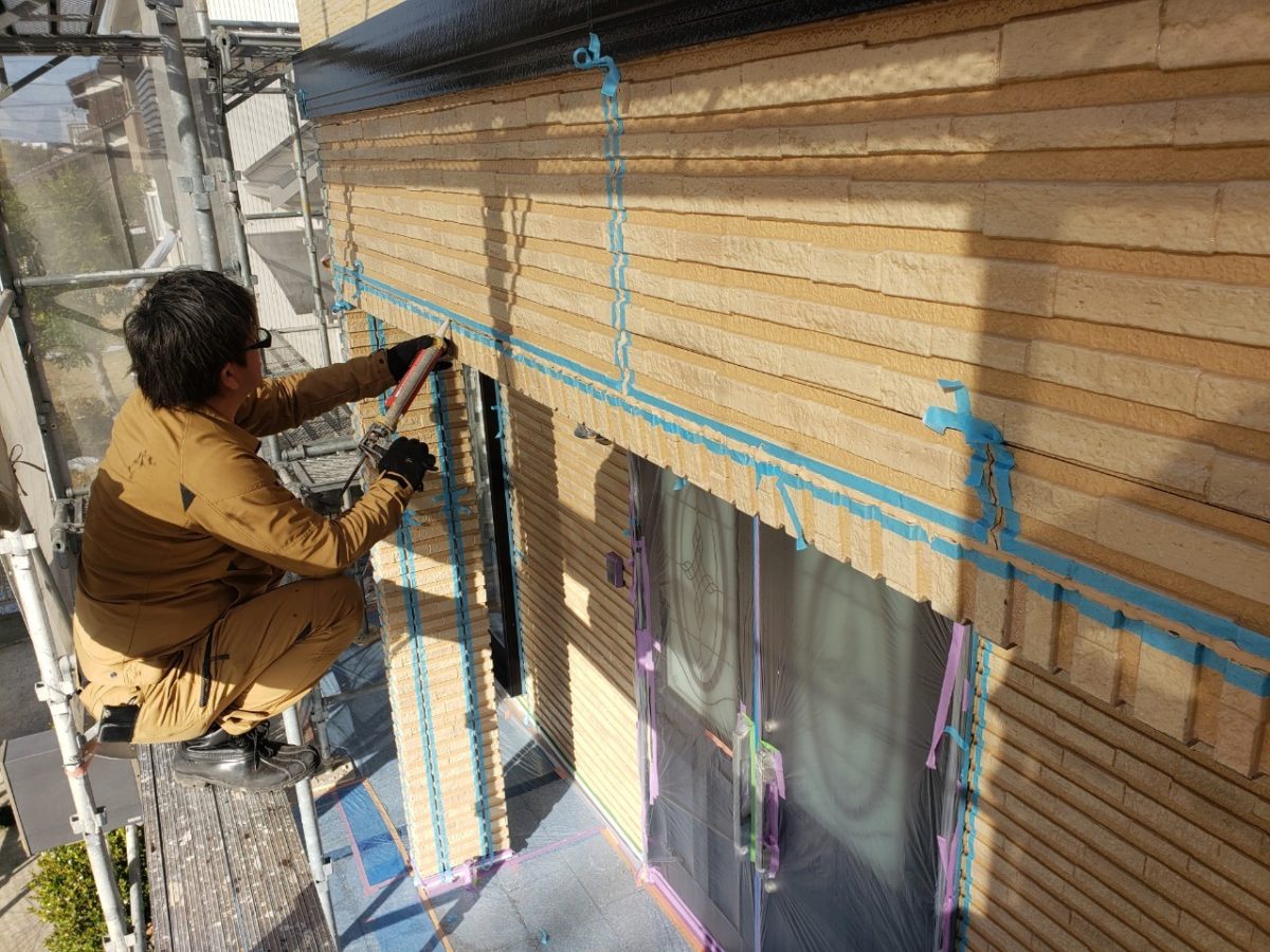 前日、サイディング専用のクリアー(透明)塗装が乾いているのでシーリング打設をやっていきます。
