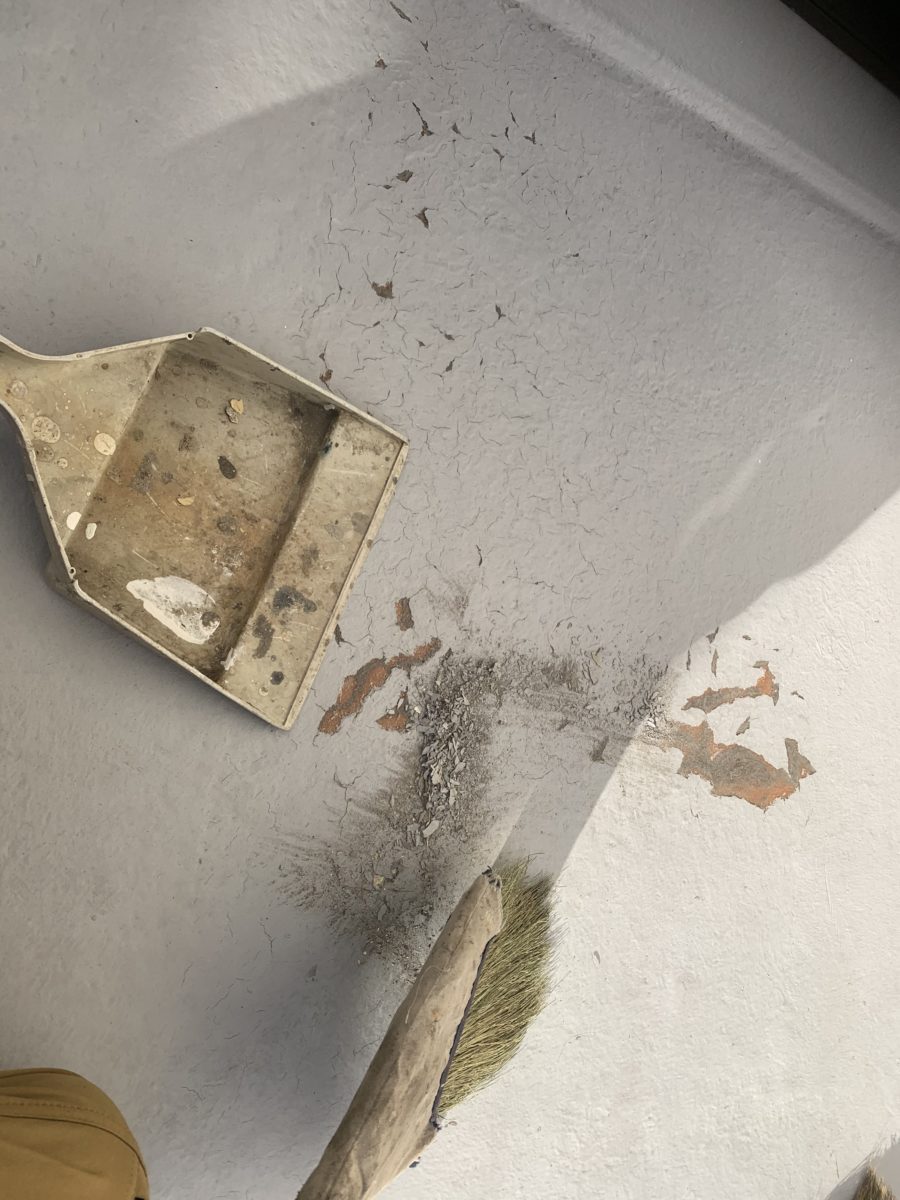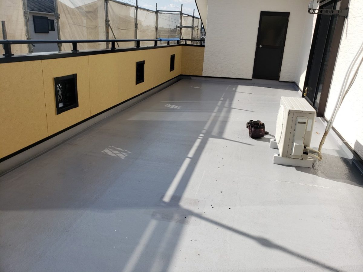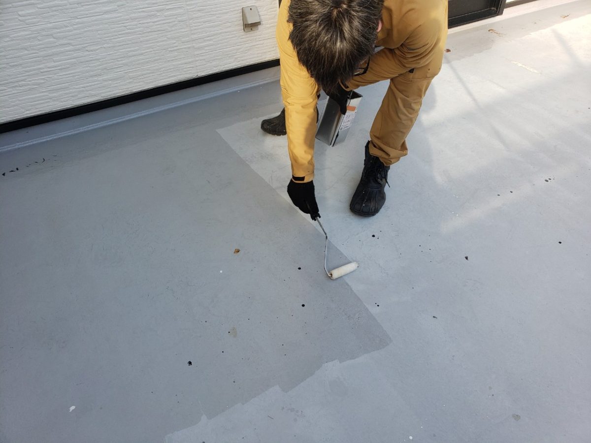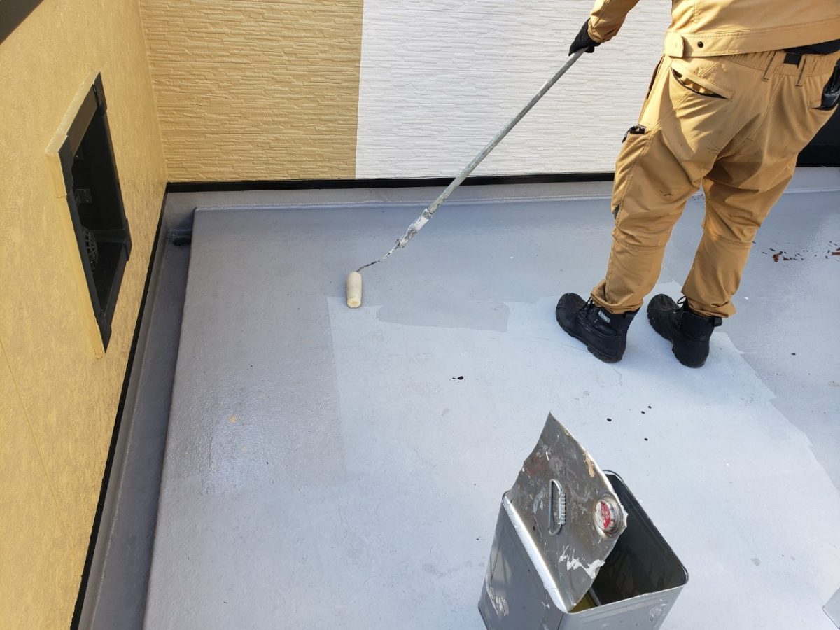 バルコニー床のFRP防水のトップ塗装の塗り替えは通常表面を全て研磨工具等で撤去してからの塗装なんですが、当社の使用しているFRP用の材料は研磨を可能な限りやって、後は塗るだけといったものになります。