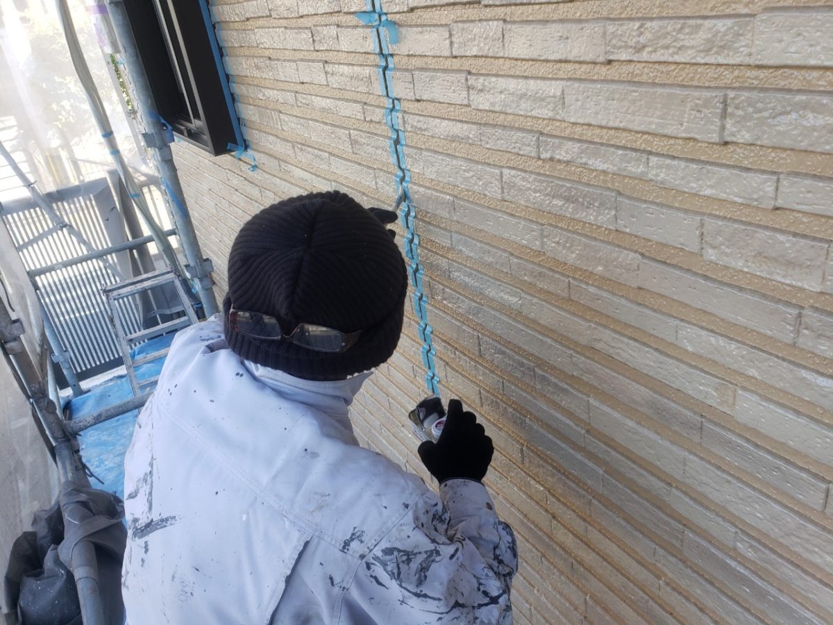 通常はシーリング完了後に塗装を3回塗りするのですが、通常の塗装と違いクリアー塗装は塗膜が硬いため、(硬いが故に塗膜は強いのですが、、、)シーリングのような伸縮する素材の上から塗ると塗膜が割れてしまいます。