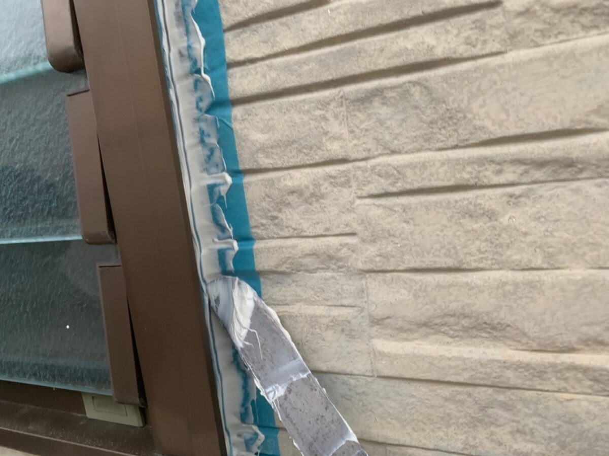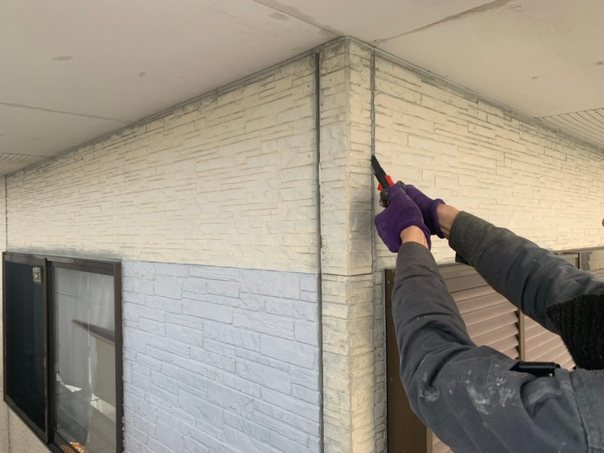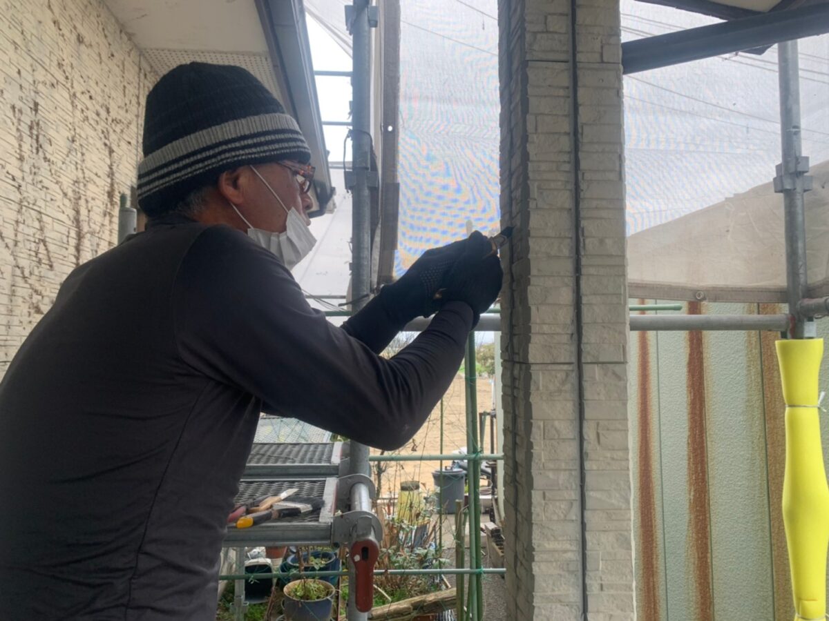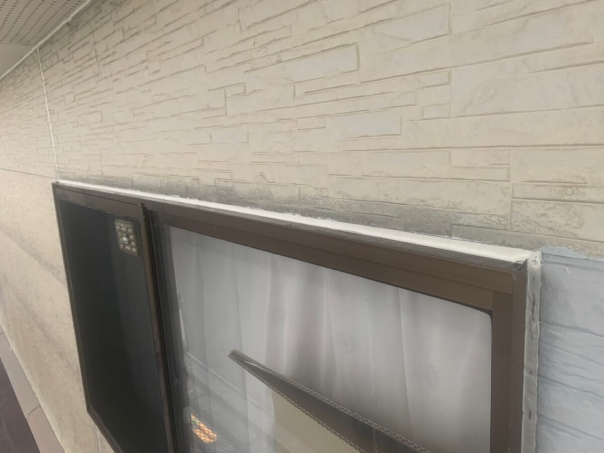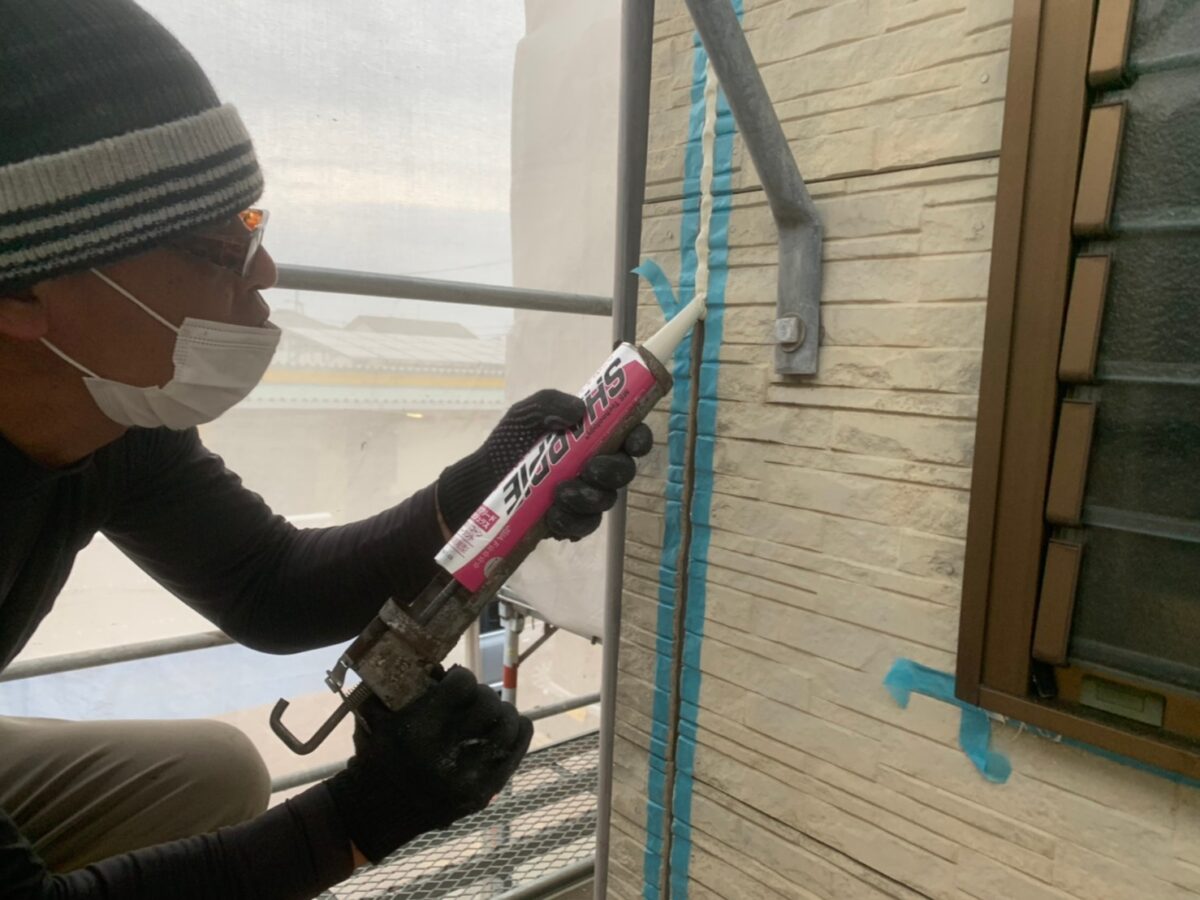 まずは例によって外壁の損傷が激しいため高圧洗浄前に水漏れ防止でシーリング工事を施します。
