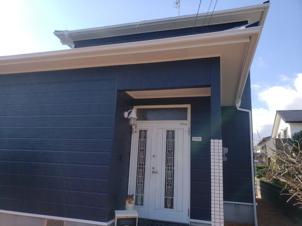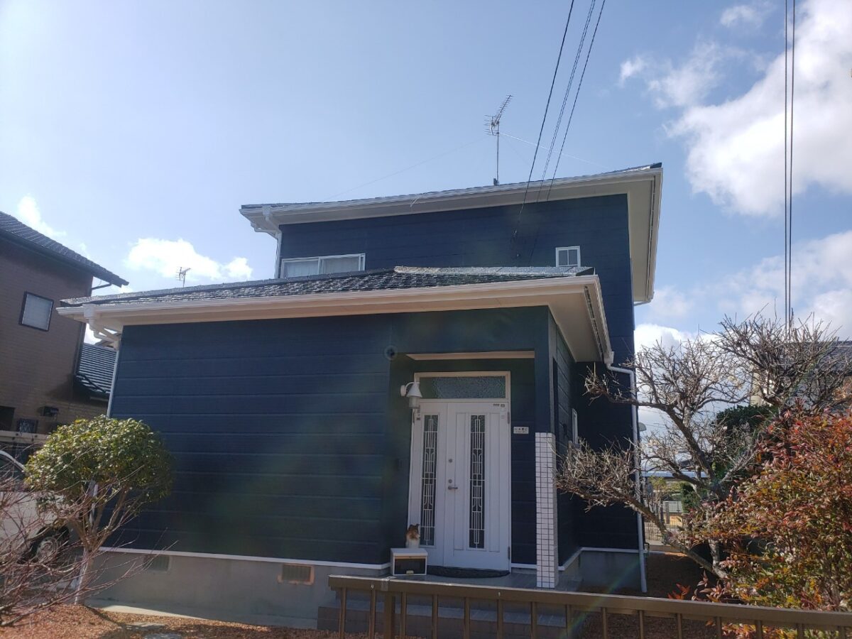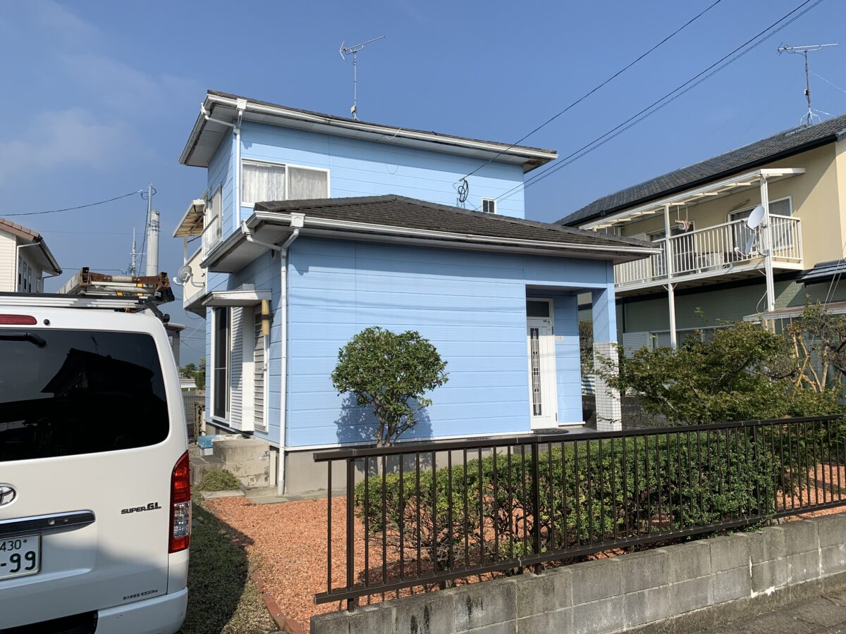 以前の塗り替え時に外壁色を濃い青色に指定していたにも関わらず水色にされて、凄い不満を持ってられてて今回ようやく思い通りの色になって大満足という評価を頂きました(^^)
