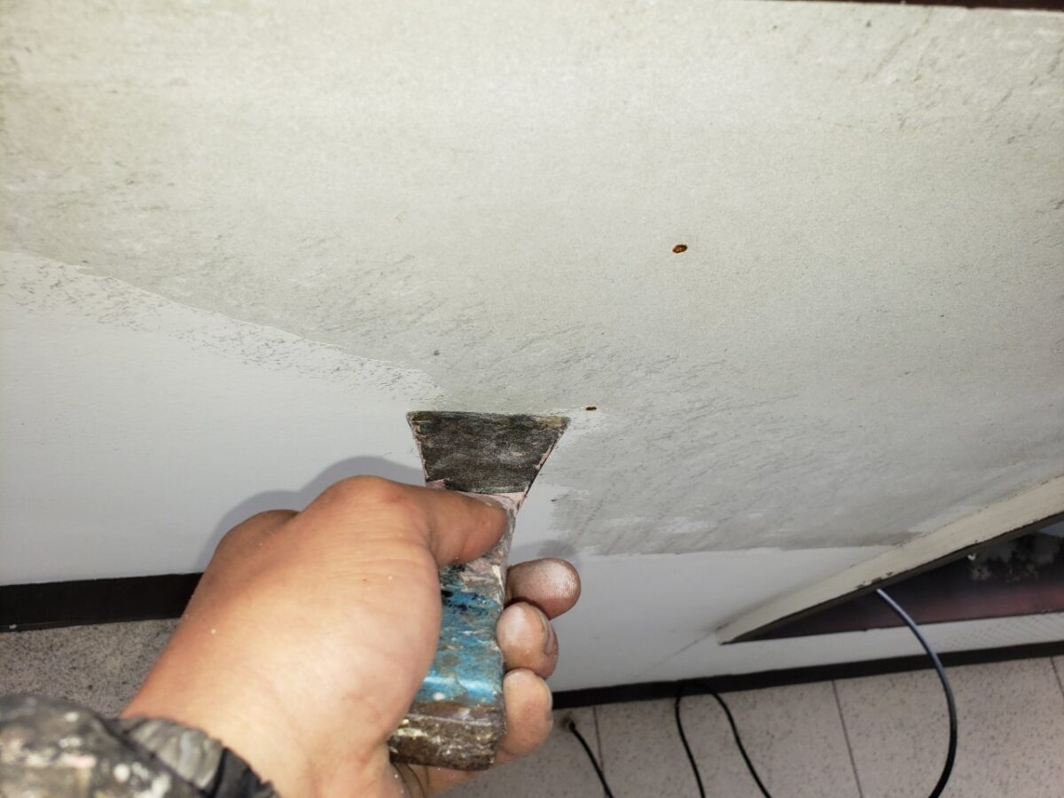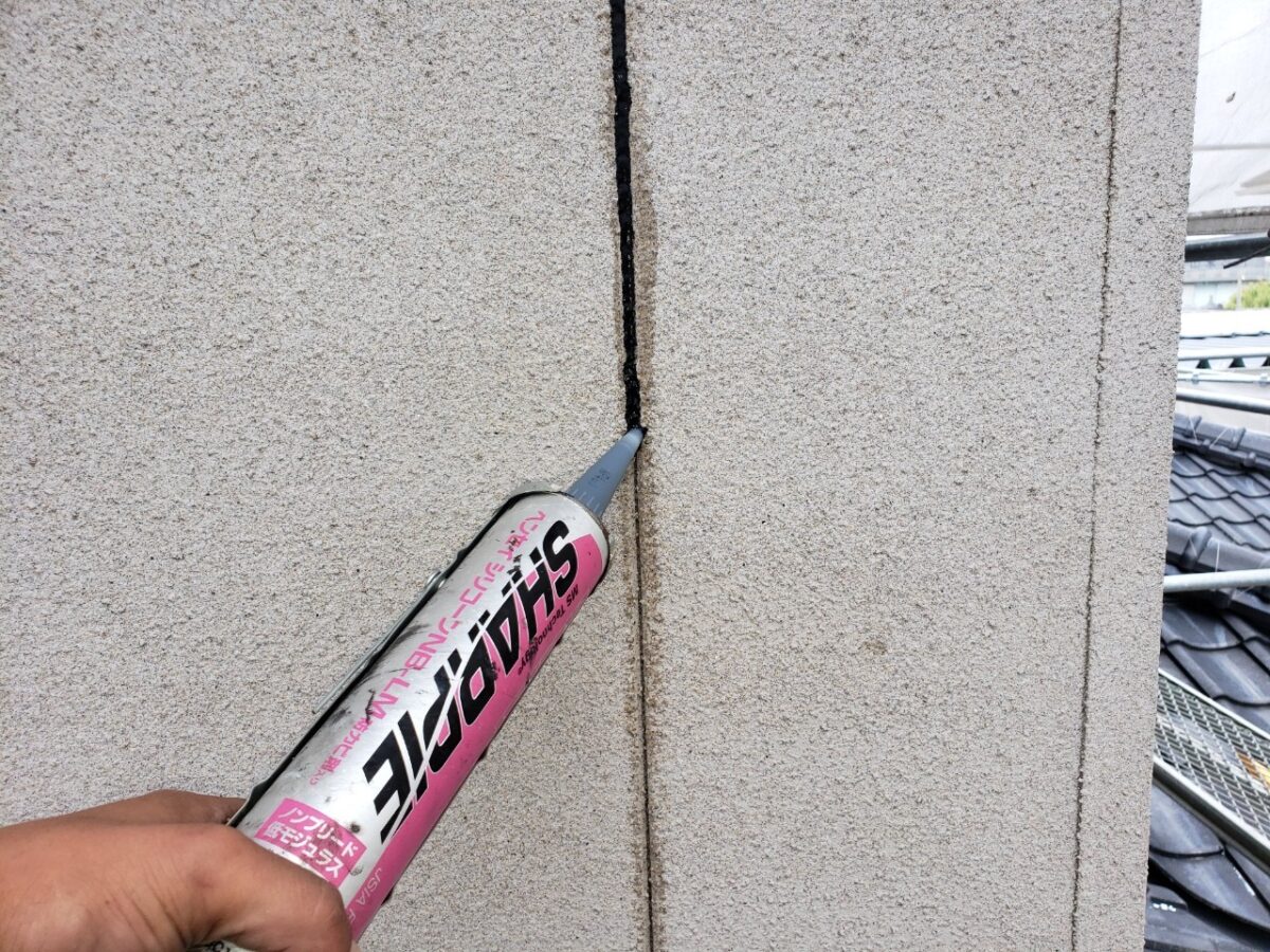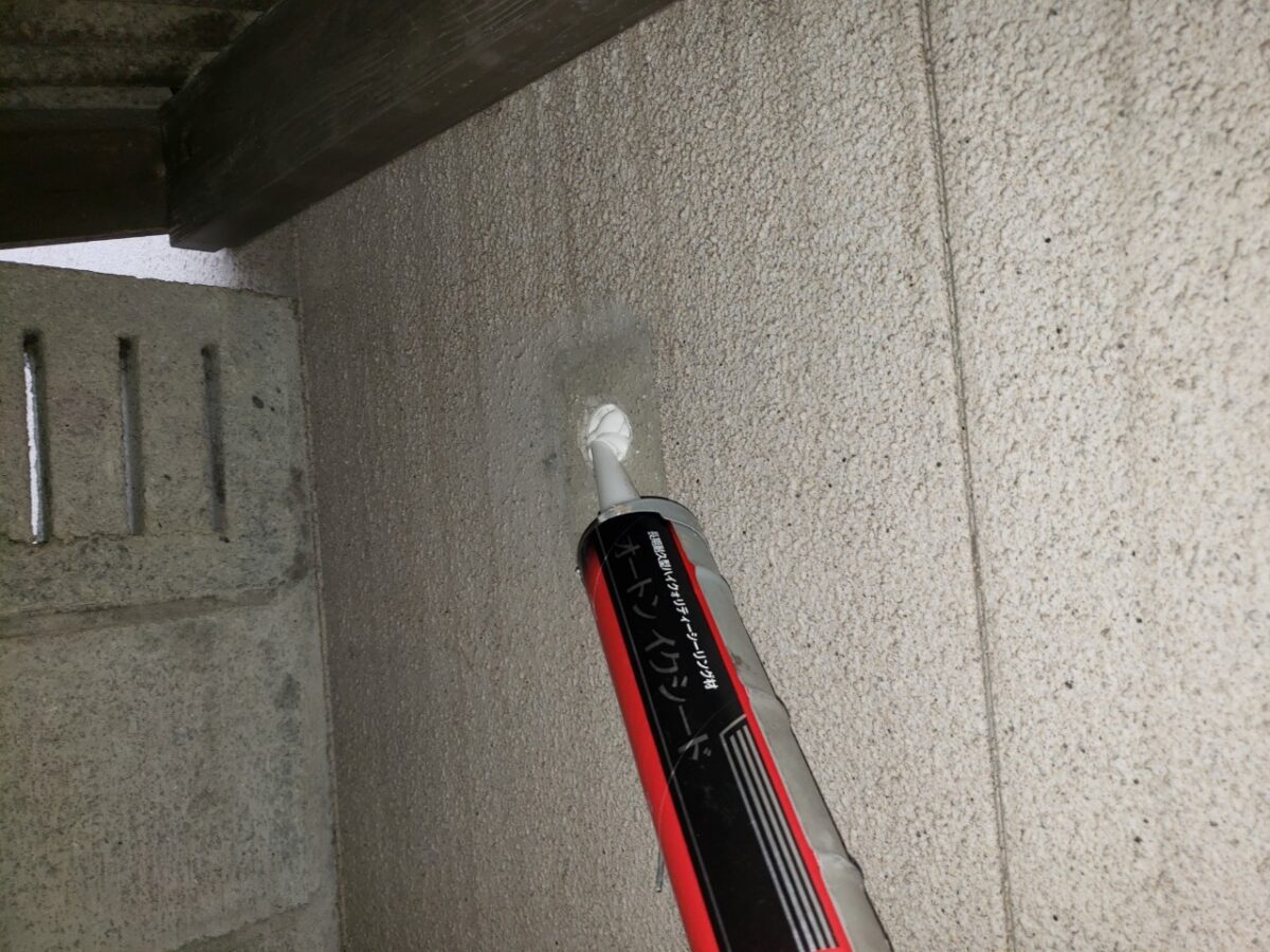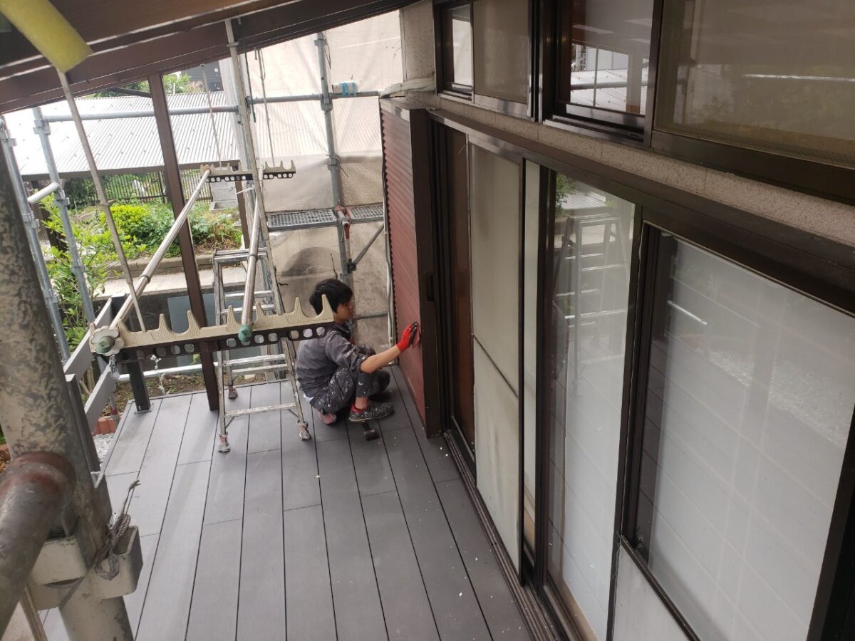 浮いた塗膜の除去や穴埋め、隙間埋めなどをやっていきます。