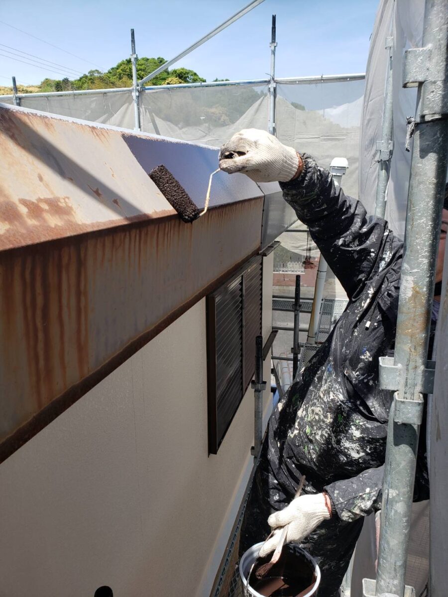 こちらの使用材料は錆止め剤配合の物ですので、錆止めは塗らずに直接上塗り材を塗っていきます。