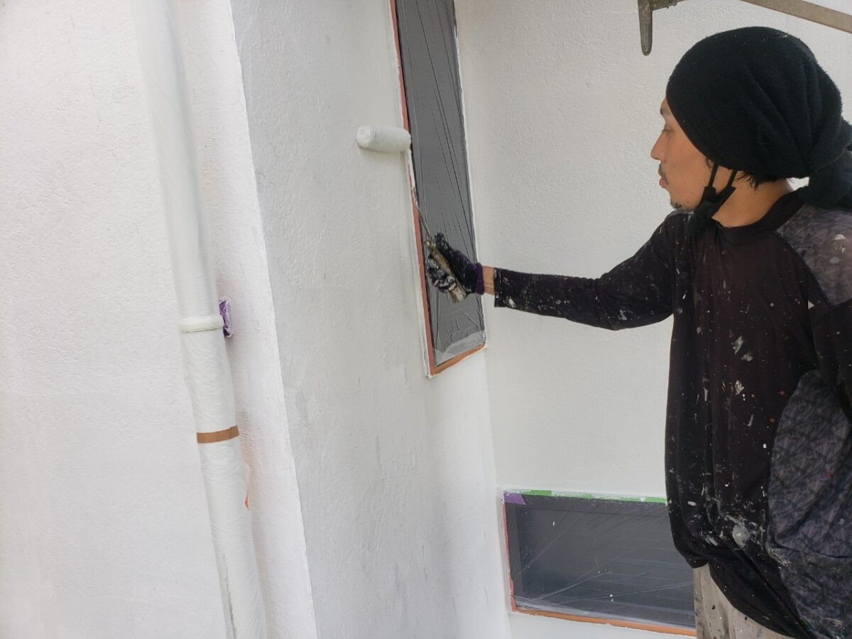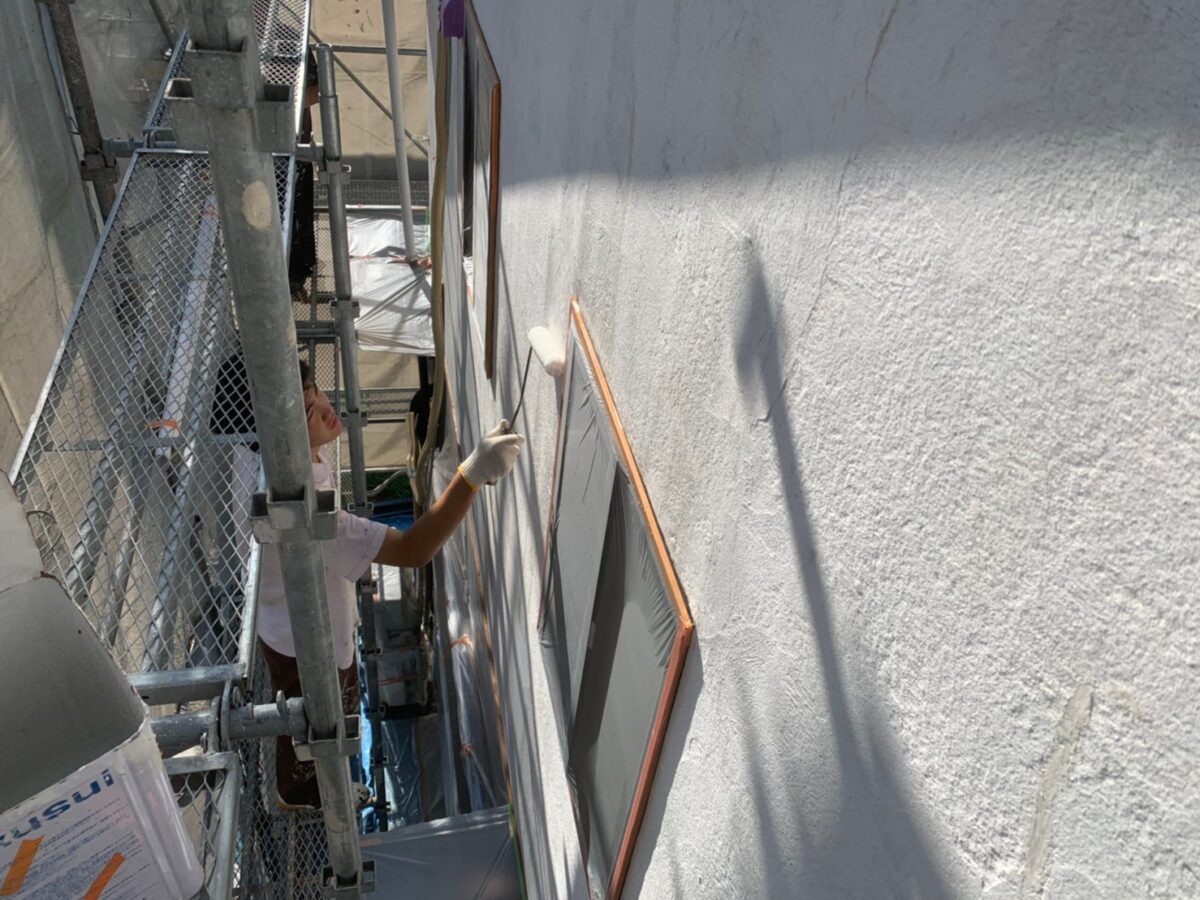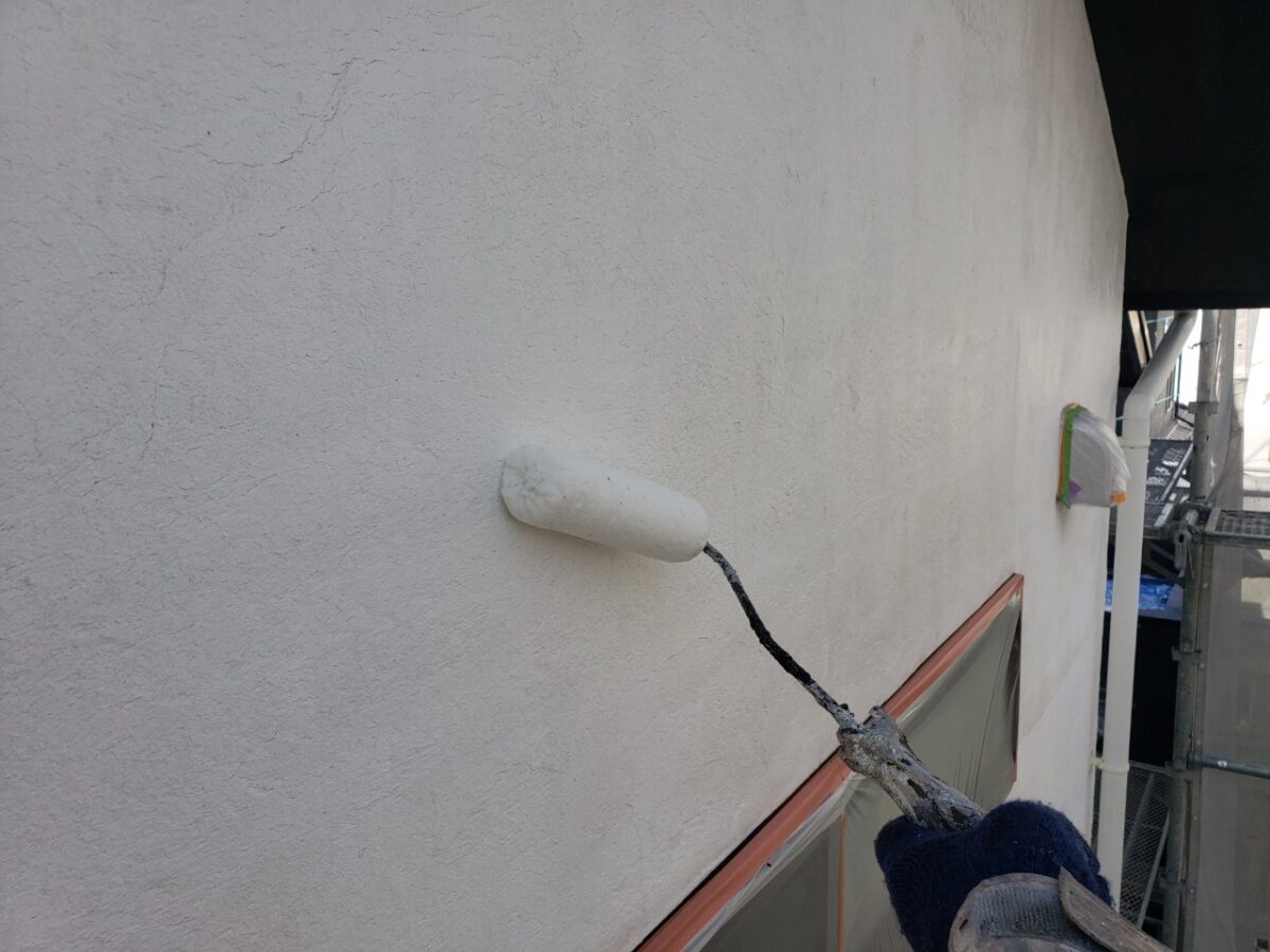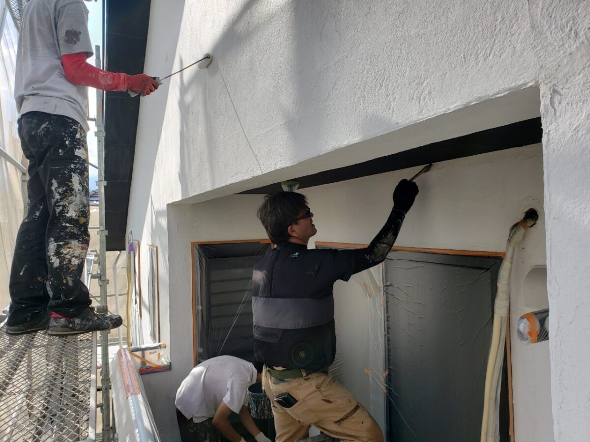 前回K様邸の下地処理が終わって塗装工程に移っていきます。
