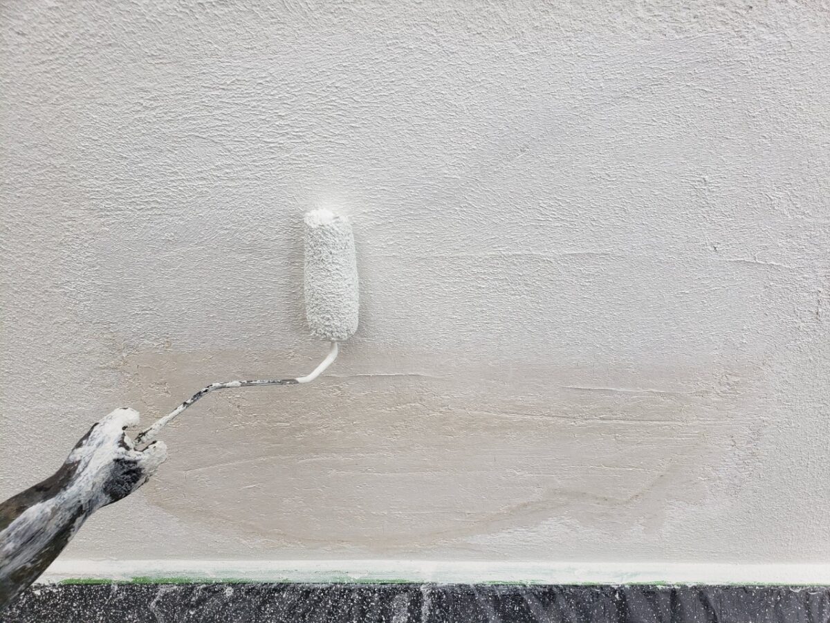 まずは前回少しご紹介した漆喰壁等の吸い込みの激しい箇所に深く浸透して内側から強化し、密着力を高めるプライマーを漆喰全体に下塗りとして塗っていきます。