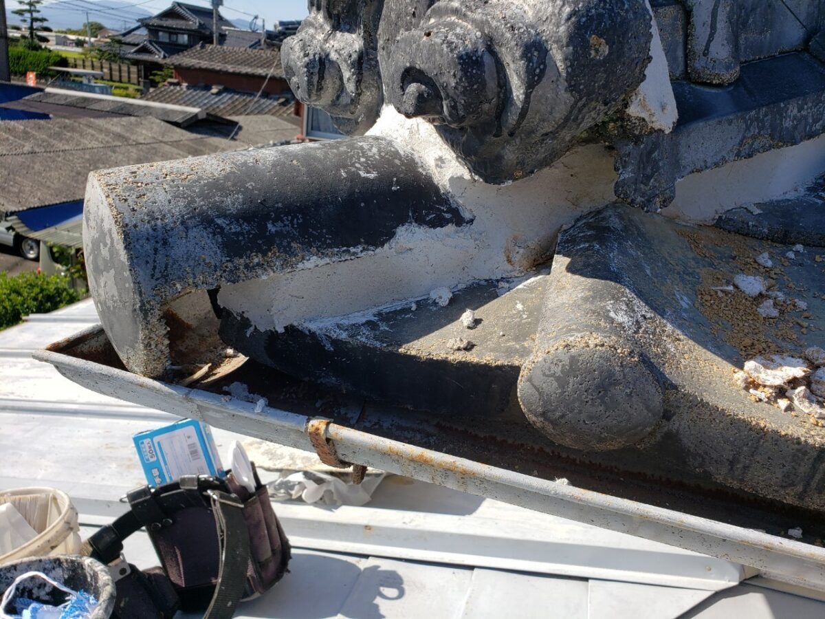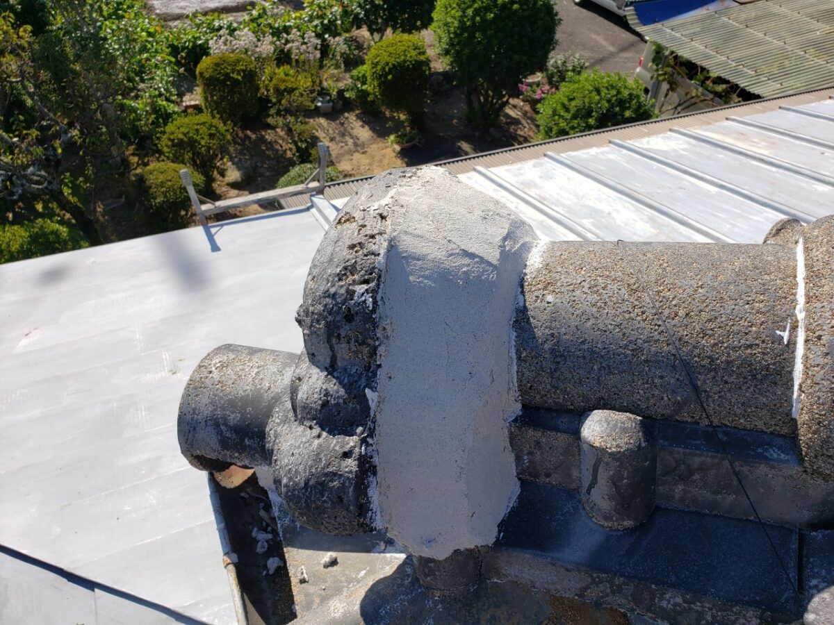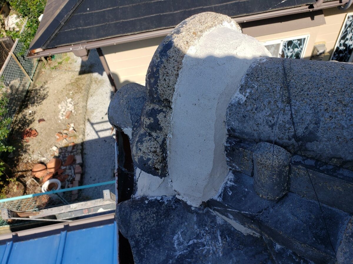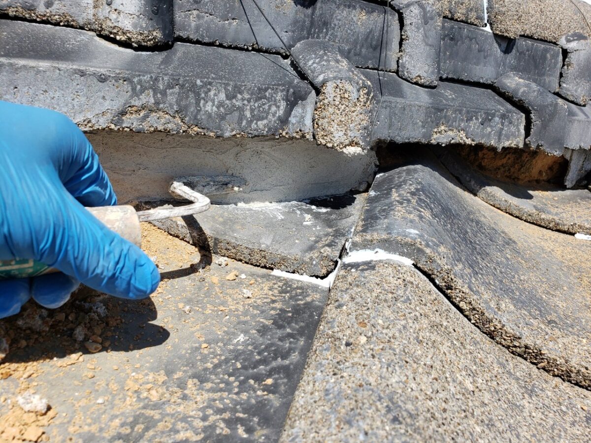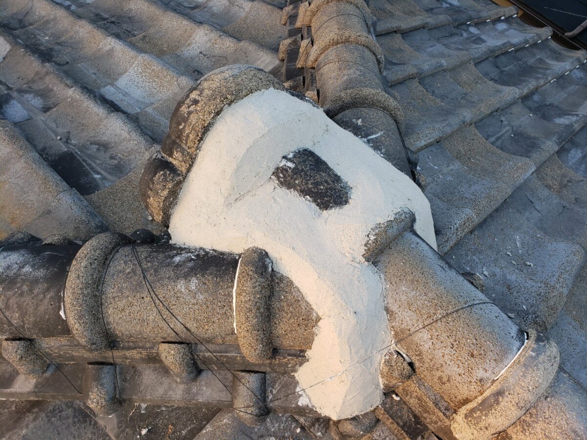次の日、屋根用の漆喰材を用いて割れたり剥がれたりしている部分を補修していきます。