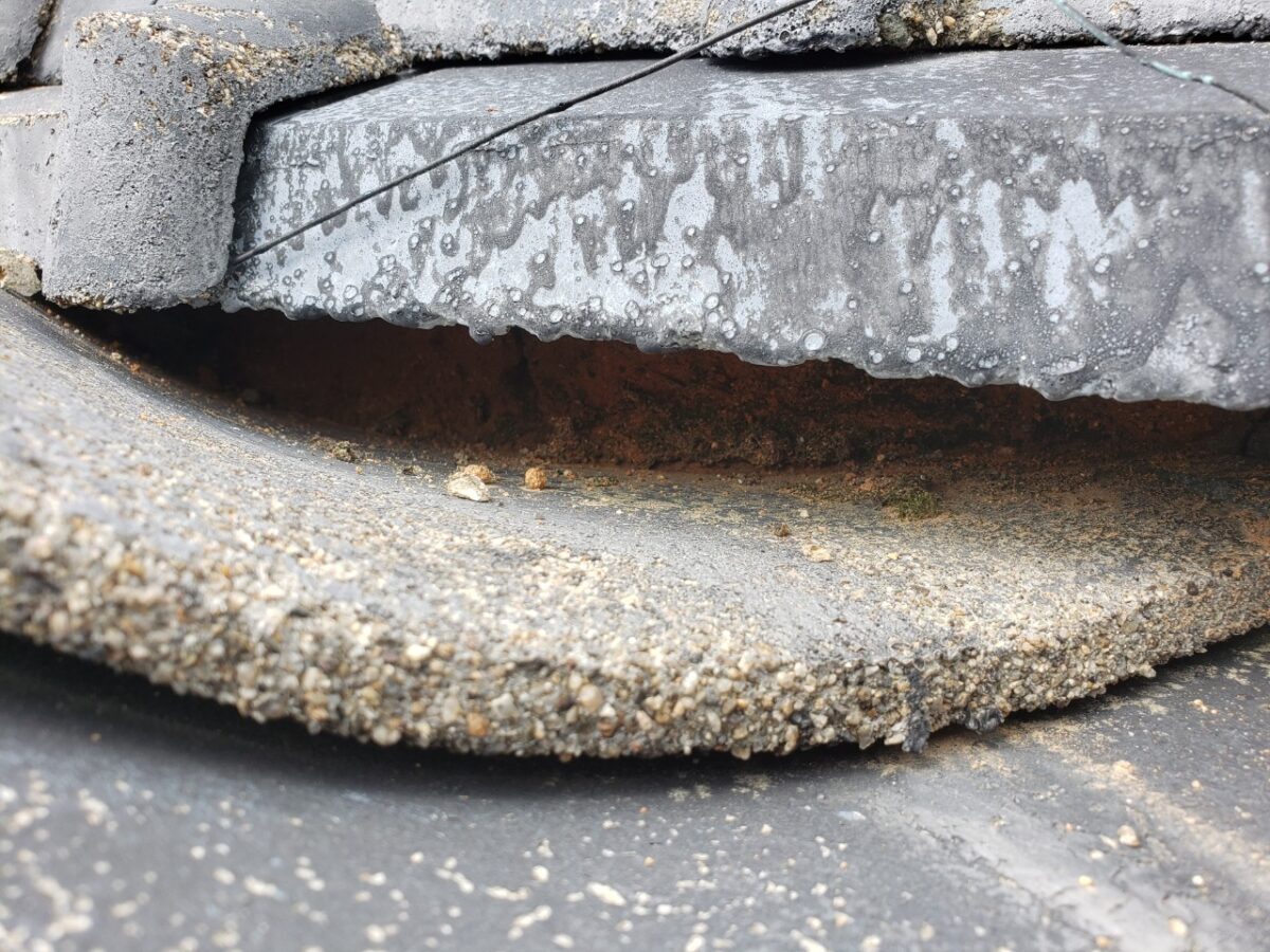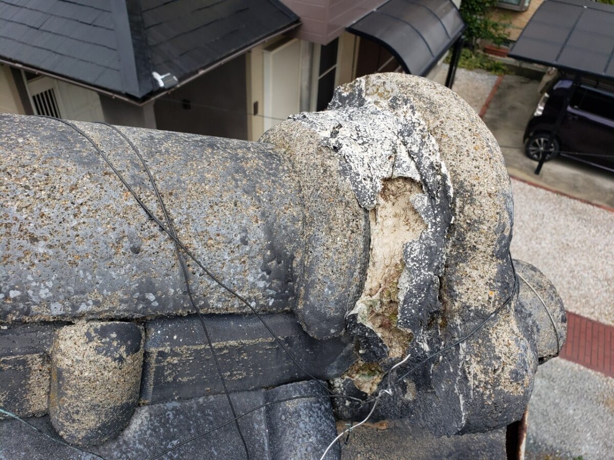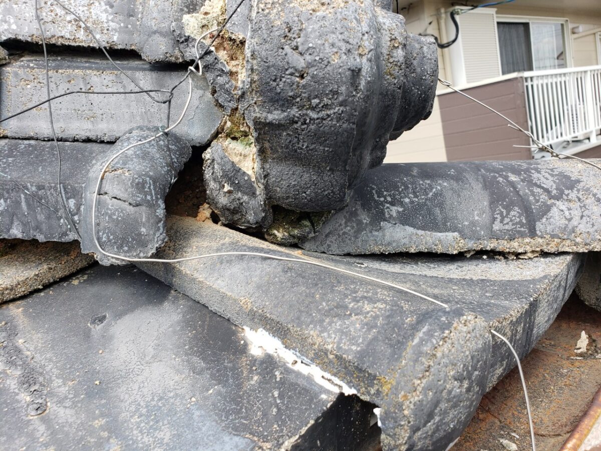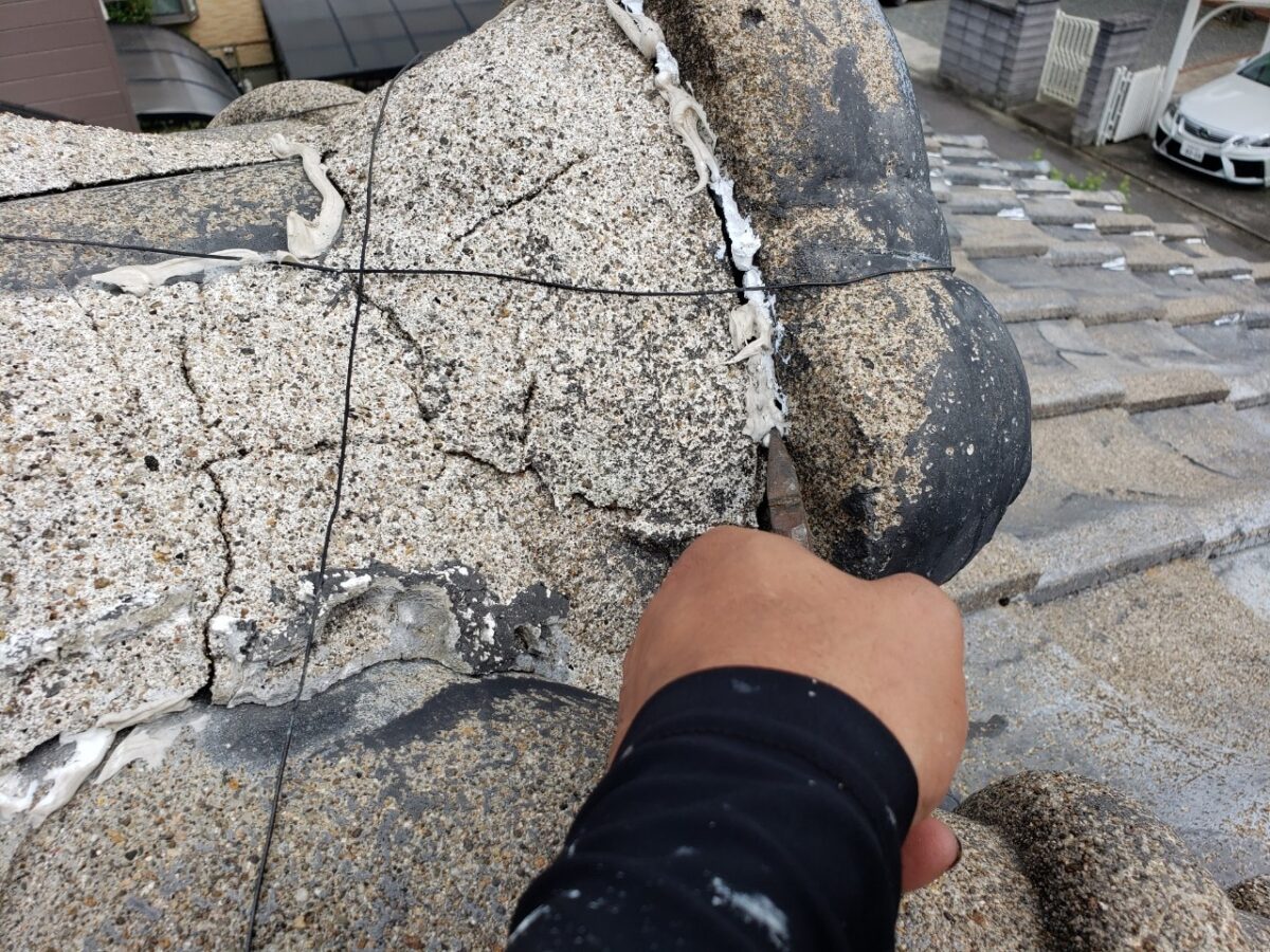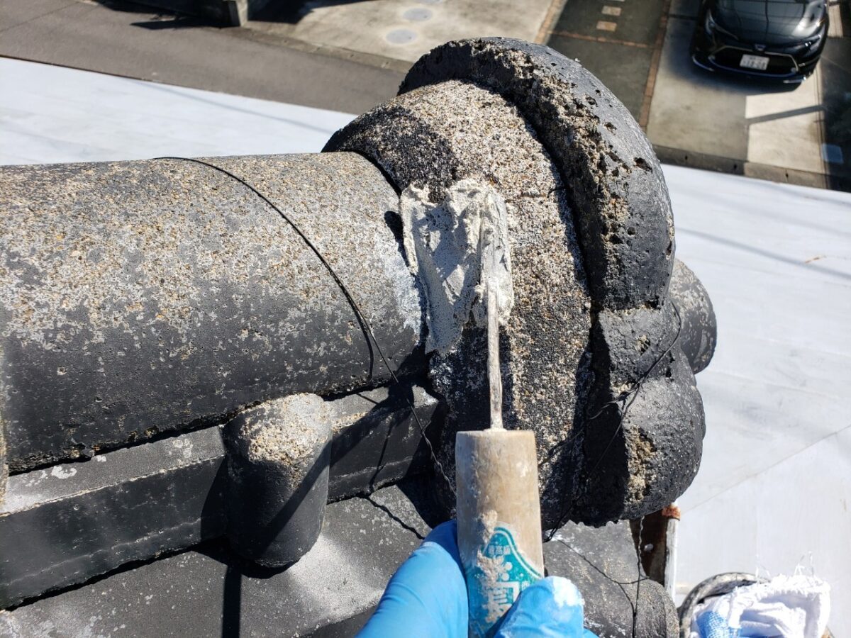 次の日、屋根用の漆喰材を用いて割れたり剥がれたりしている部分を補修していきます。
