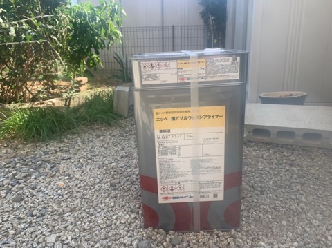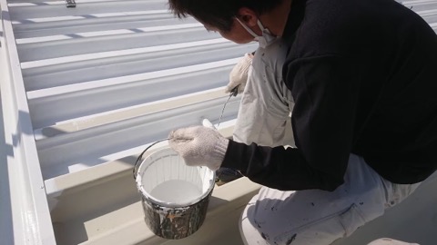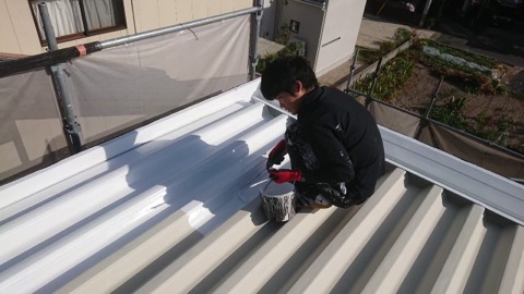 塩化ビニール製の屋根材ですので、それ専用の下塗りをしていきます。