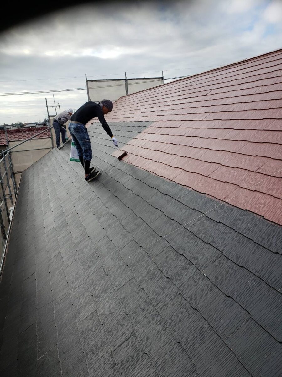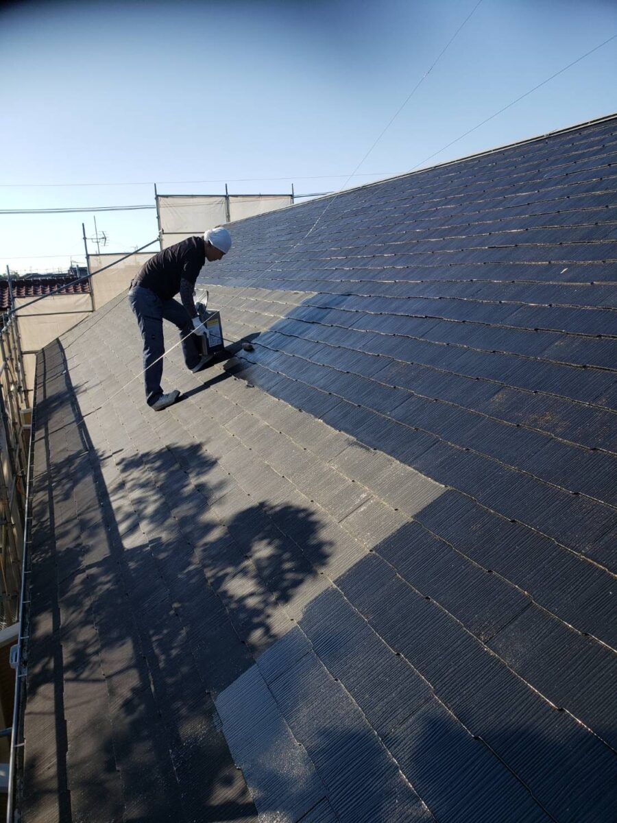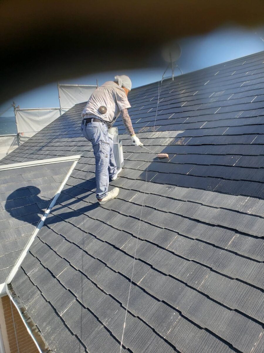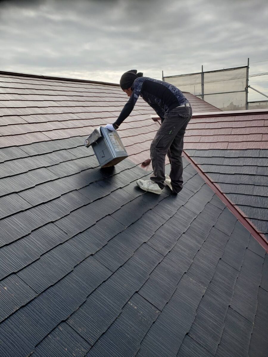 外壁下塗り後は屋根の下塗りをやっていきます。