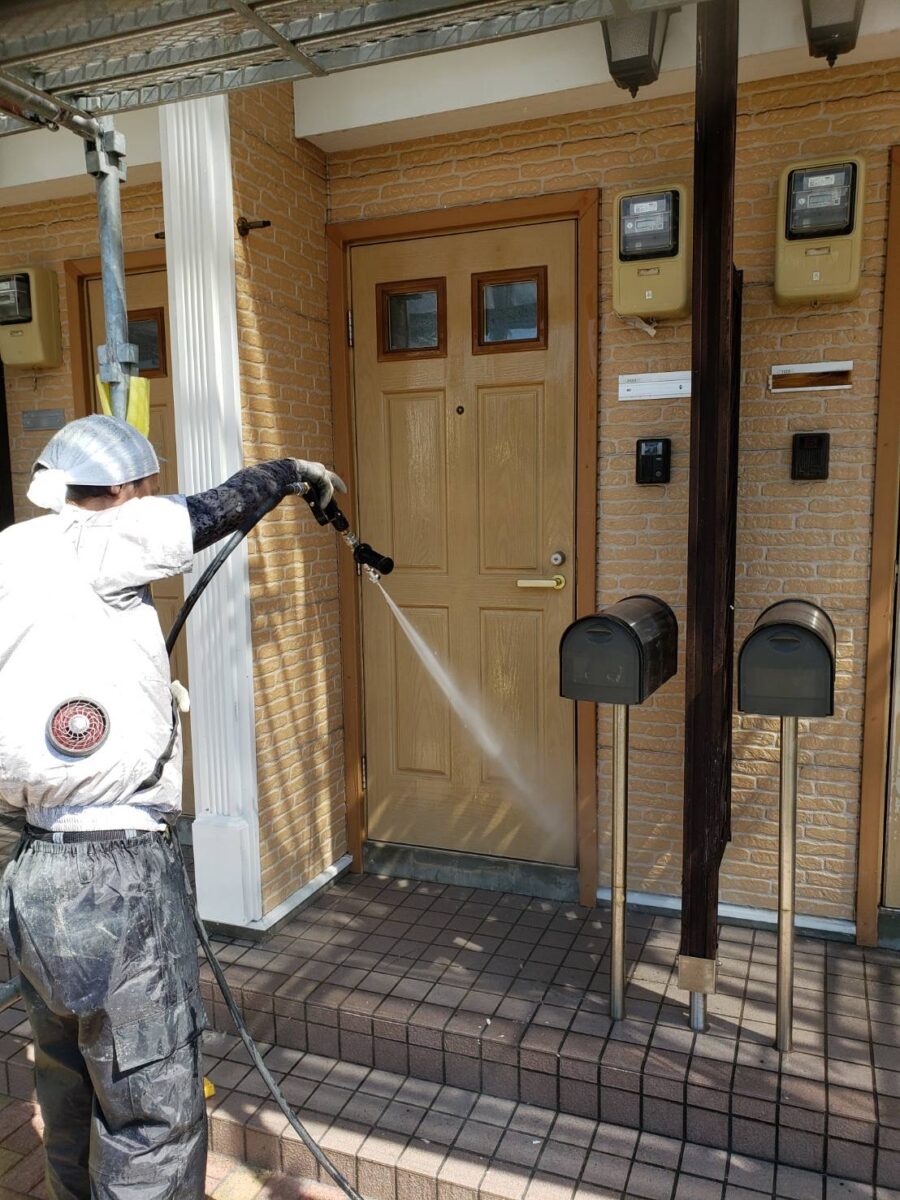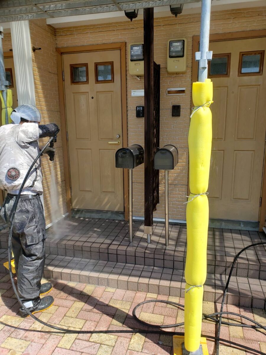 足場組み立て後はまず高圧洗浄です。