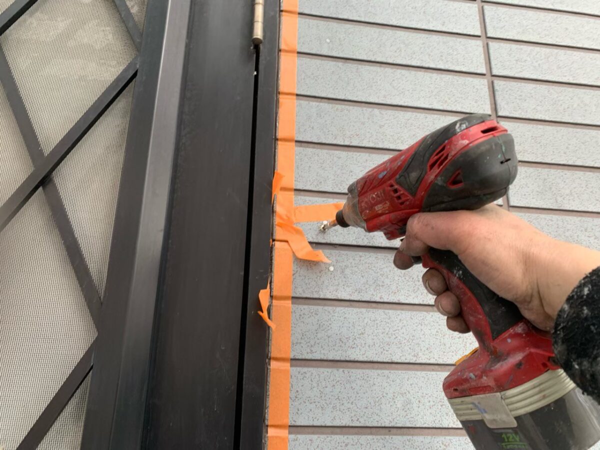 シーリングで固めてしまう前に、浮いた外壁材にビスを打ち込み、浮きを直します。
