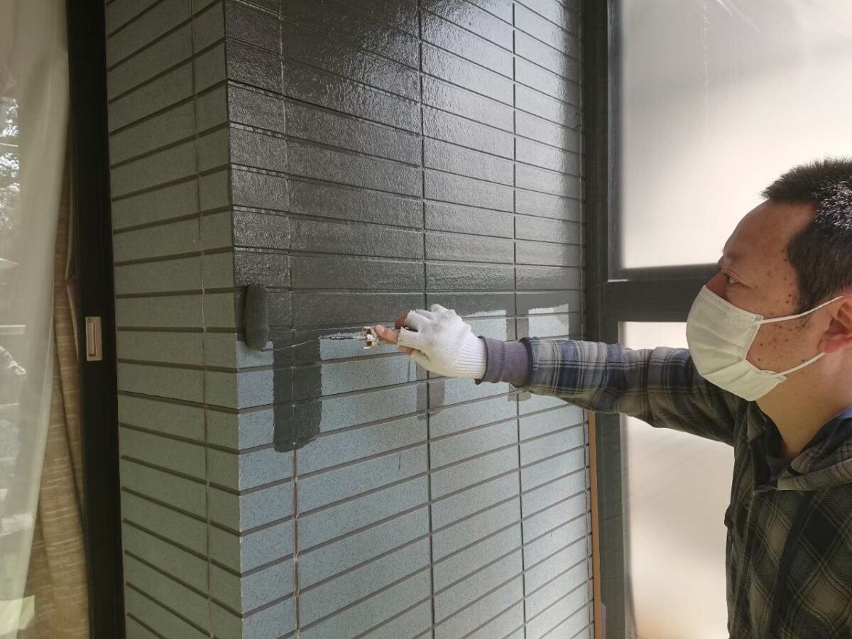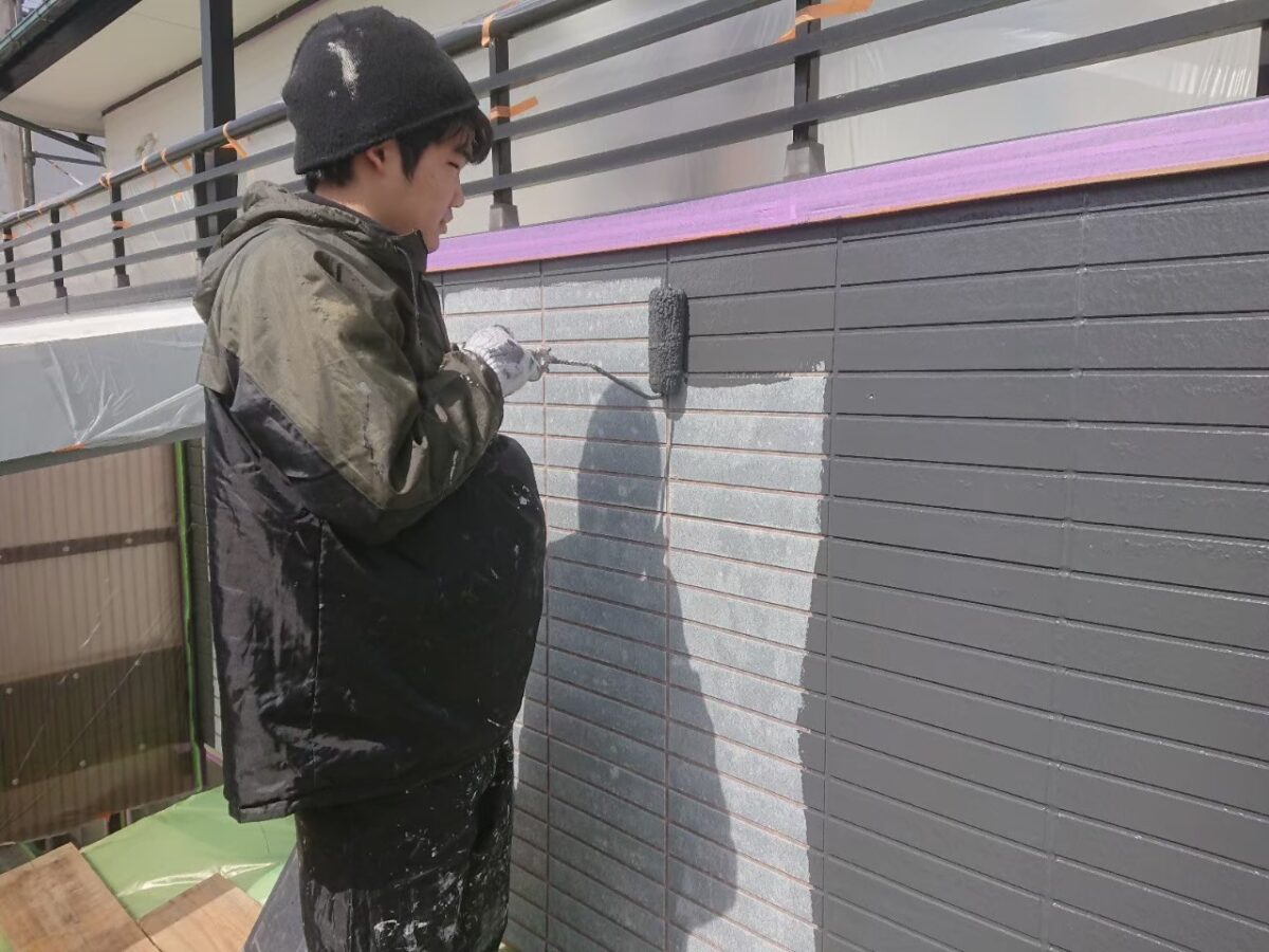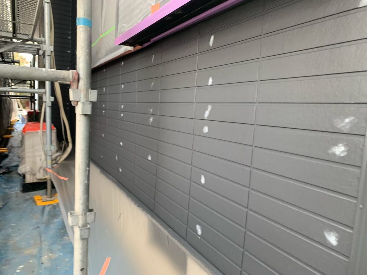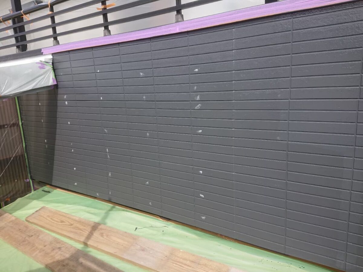 使用材料のEBムーンガードは下塗りが既に上塗りと同じ色ですので、ツートーン仕上げの目地色に合わせて濃いグレー色となってます。