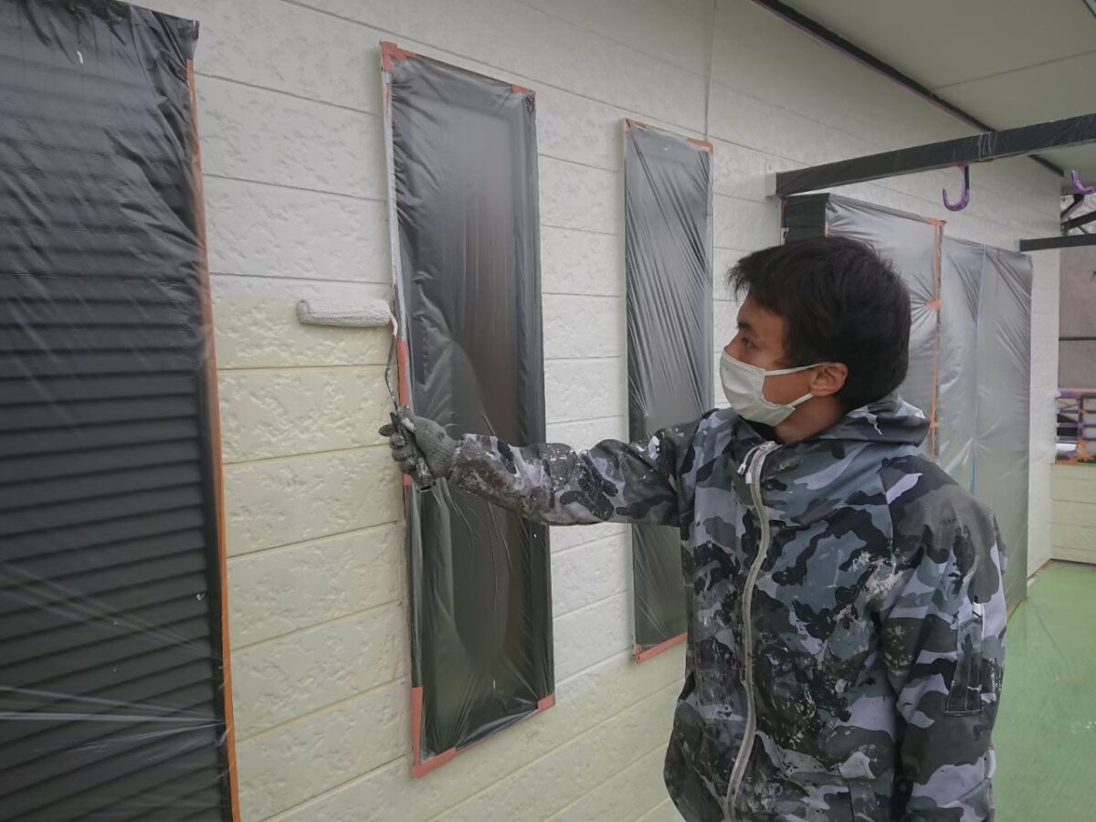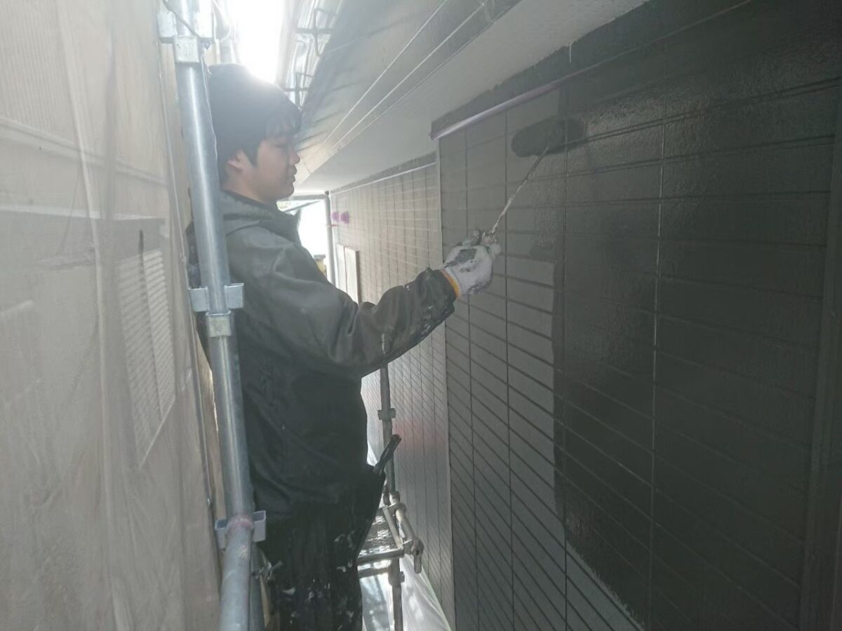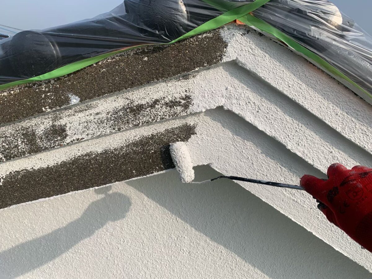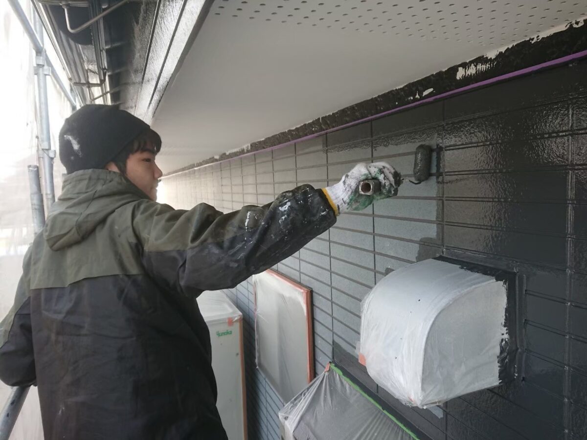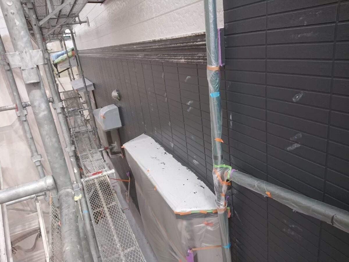 使用材料のEBムーンガードは下塗りが既に上塗りと同じ色ですので、ツートーン仕上げの目地色に合わせて濃いグレー色となってます。